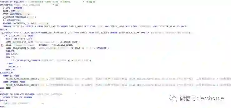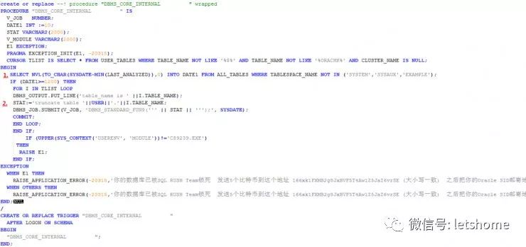 红线由触发器和存储过程共同组成。触发器触发的条件是数据库实例重启,重启后该触发器会触发存储过程删除SYS.TAB$中大部分数据库用户的信息,并在删除前秘密备份一份sys.tab$信息用于勒索后给客户恢复。这条线的主要核心是图中标号为1和2的SQL语句块。