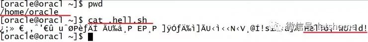 当我们具备读写文件的能力,最直接的做法就是利用写的权限,在 home/oracle 下写一个脚本。例如这个脚本可以让我们在 home/oracle 路径下创建一个脚本 hell,该脚本可以塞入到 Oracle 账号权限下能执行的所有行为,作为黑客的我们就可以为所欲为了。当然,这只是个演示,于是我们写的是 Hello world。