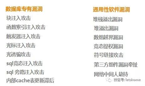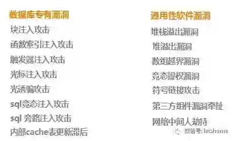 数据库漏洞威胁一直是数据库的严重威胁。从不同角度来看数据库存在多种不同分类方式,按照漏洞属性分,数据库漏洞大体分为两种类型:第一是数据库专有漏洞,第二类是通用性软件漏洞。