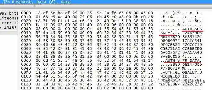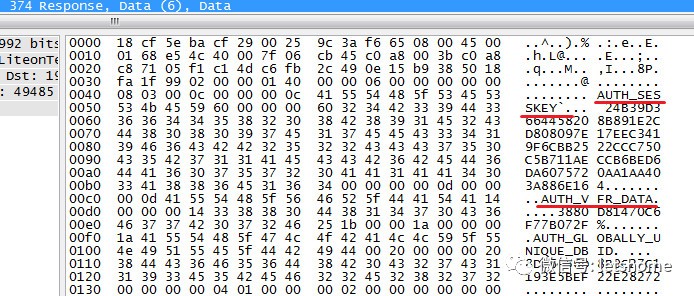 上文提到客户端发给服务器的第一个包,上图中画红线的位置就是此次进行身份验证的用户,用户名是明文的。再看服务器给客户端的回包,回包中存在两个关键参数,也就是随机盐:AUTH_sesskey 和auth_vfr_data。其中,AUTH_sesskey是以Oracle_hase 为key 用当时系统通过一些列参数生成的40个字节随机数,使用aes-256-cbc进行加密生成;Oracle_hase则是Oracle中存储的对应用户名的密钥进行sha1和md5的结果。后面的客户端的 auth_sesskey 和 auth_password 也是通过类似的手段计算得出。
