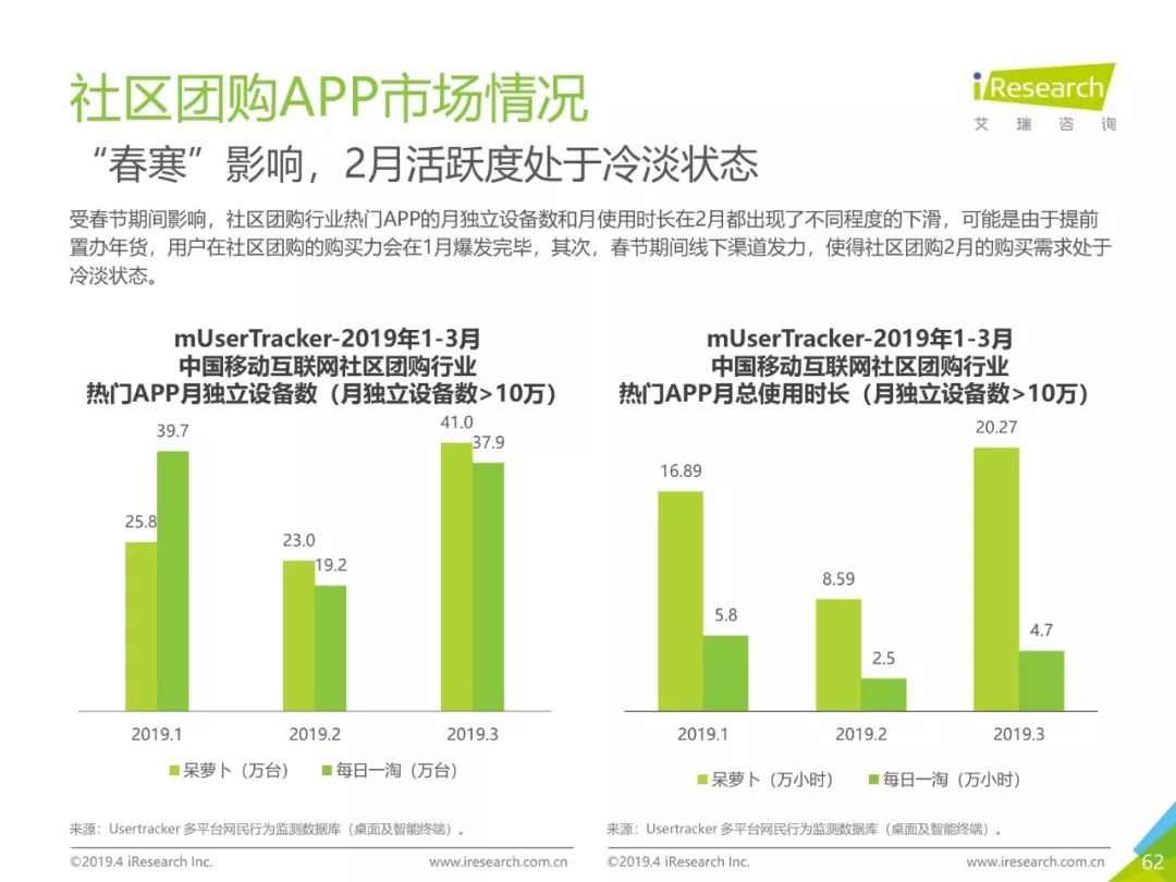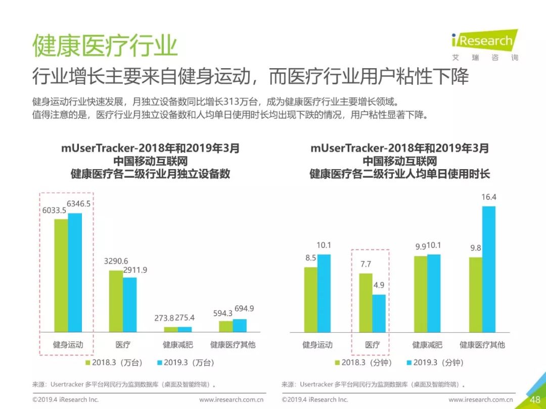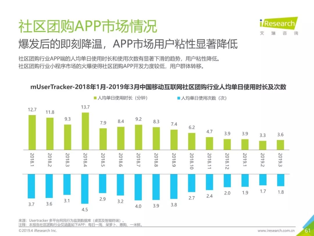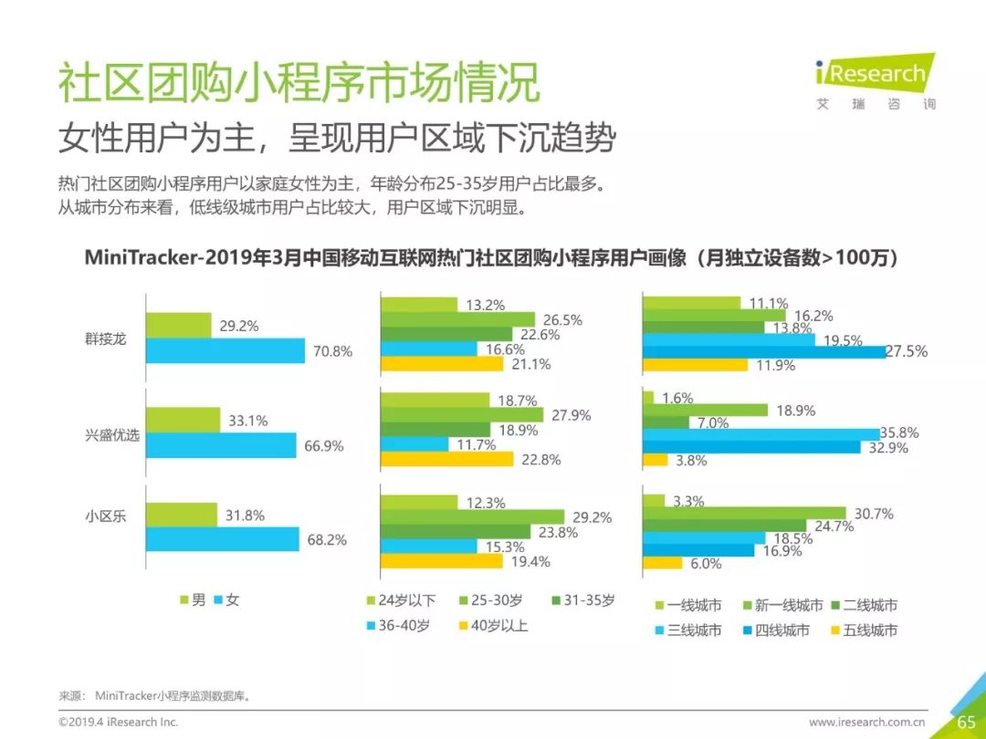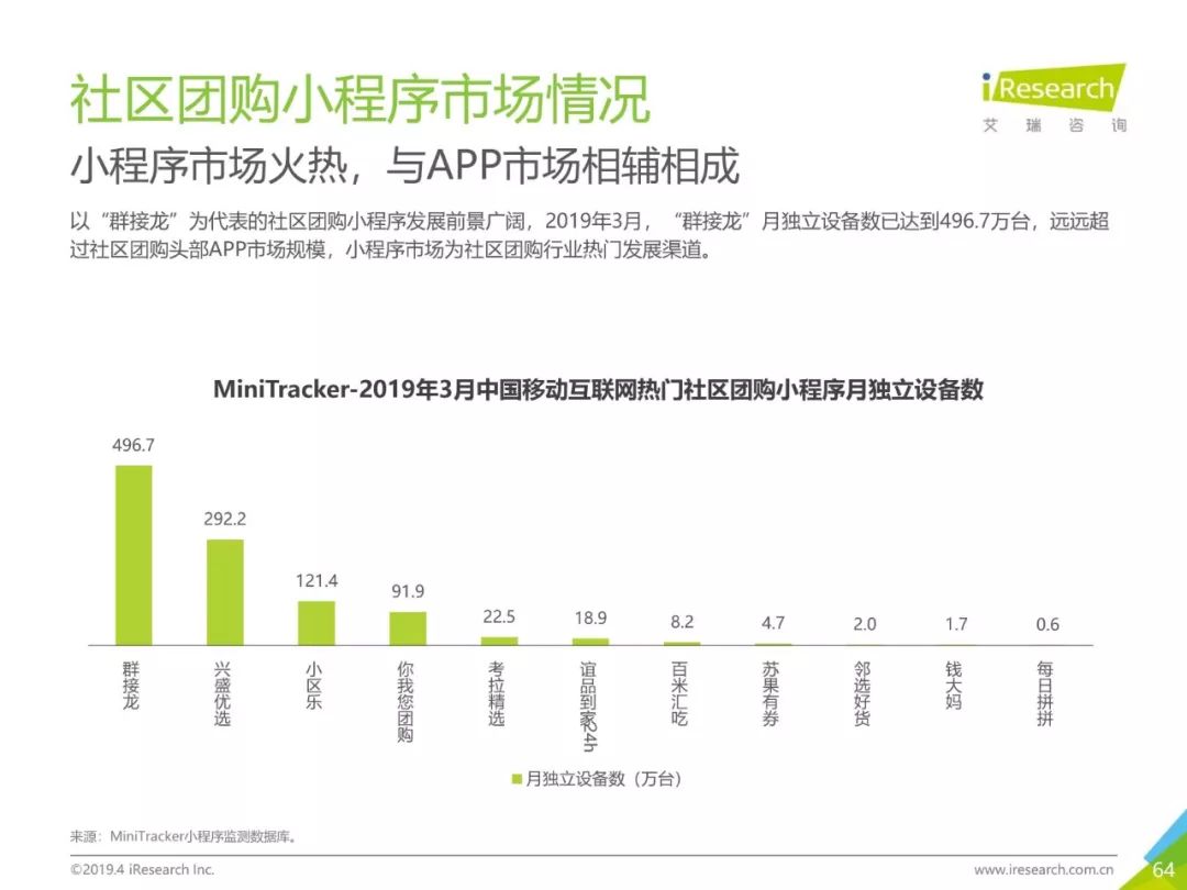 健康话题引起用户关注,大数据助力健康医疗生态,健康医疗行业成为2019年Q1热门行业。2019年3月,月独立设备数已达0.98亿台,行业增长主要来自健身运动,医疗行业粘性提升。同时小程序加持,社区团购成为热门流量风口,2019年3月,热门社区团购小程序“群接龙”月独立设备数已达到496.7万台,远远超过社区团购头部APP市场规模,小程序市场为社区团购行业热门发展渠道。
