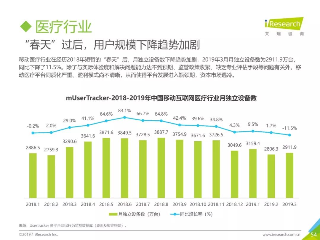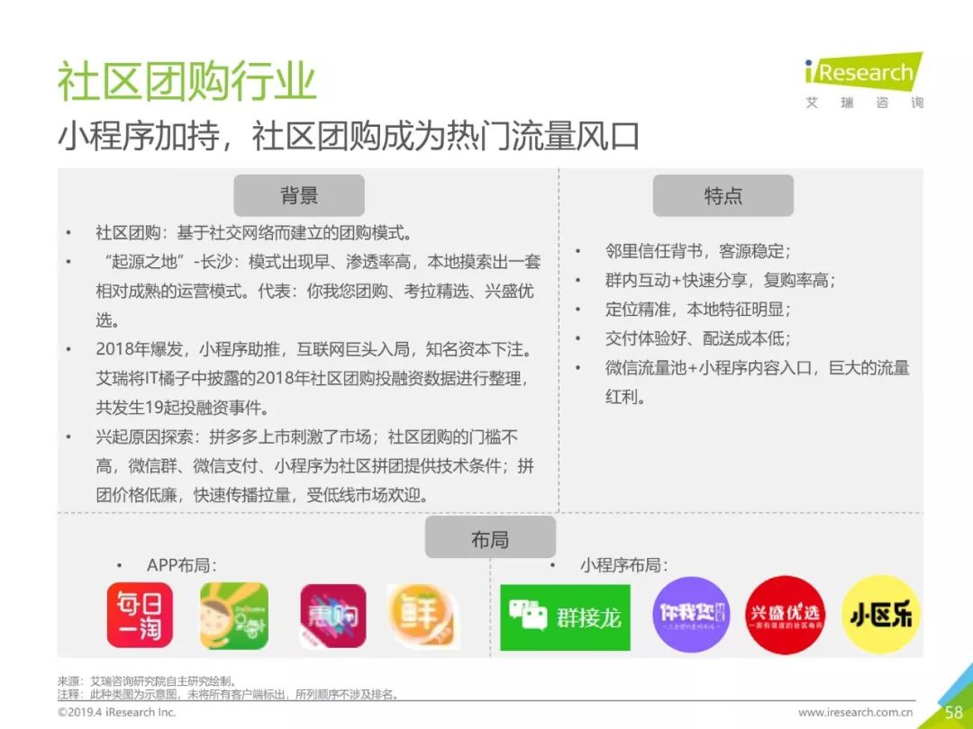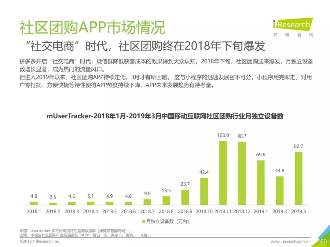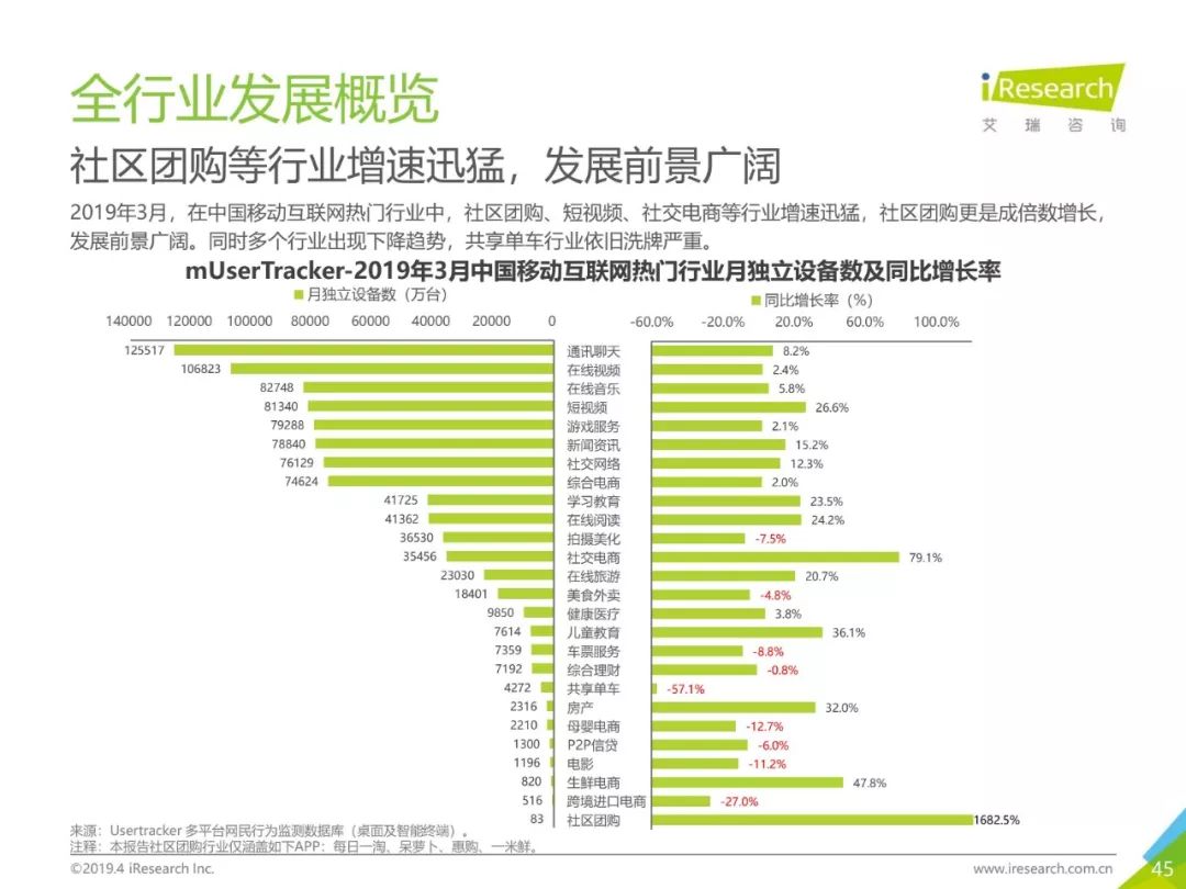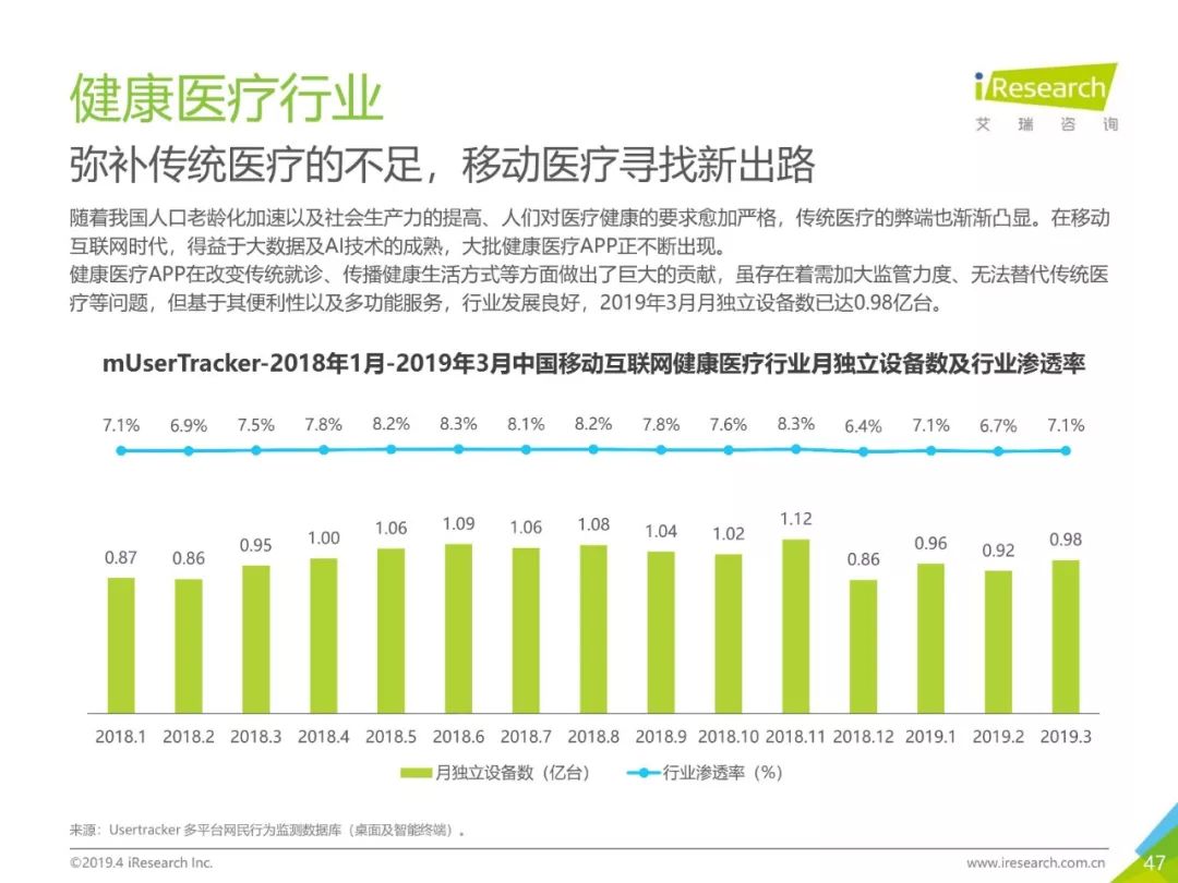 健康话题引起用户关注,大数据助力健康医疗生态,健康医疗行业成为2019年Q1热门行业。2019年3月,月独立设备数已达0.98亿台,行业增长主要来自健身运动,医疗行业粘性提升。同时小程序加持,社区团购成为热门流量风口,2019年3月,热门社区团购小程序“群接龙”月独立设备数已达到496.7万台,远远超过社区团购头部APP市场规模,小程序市场为社区团购行业热门发展渠道。