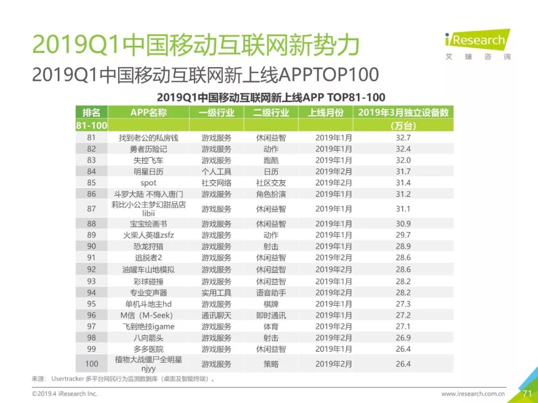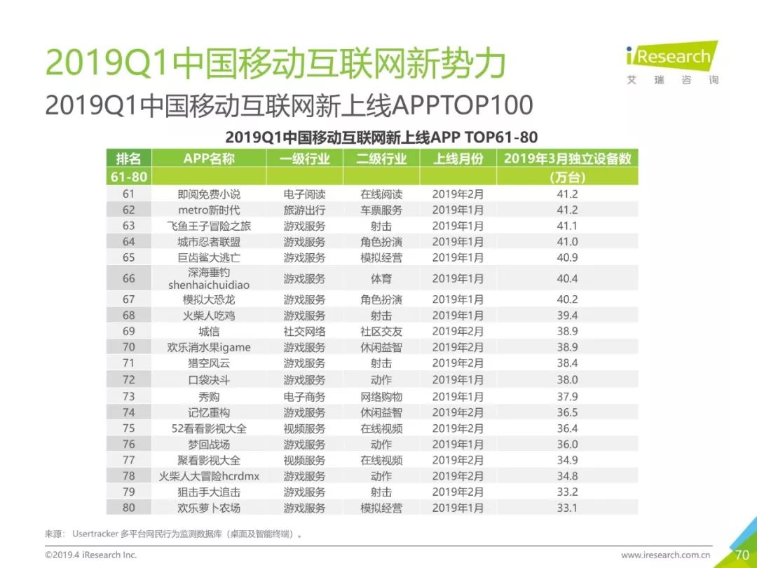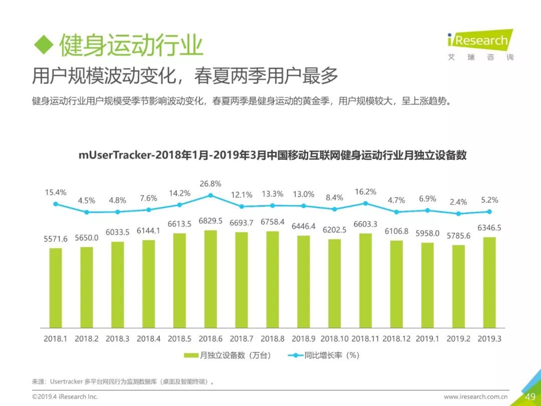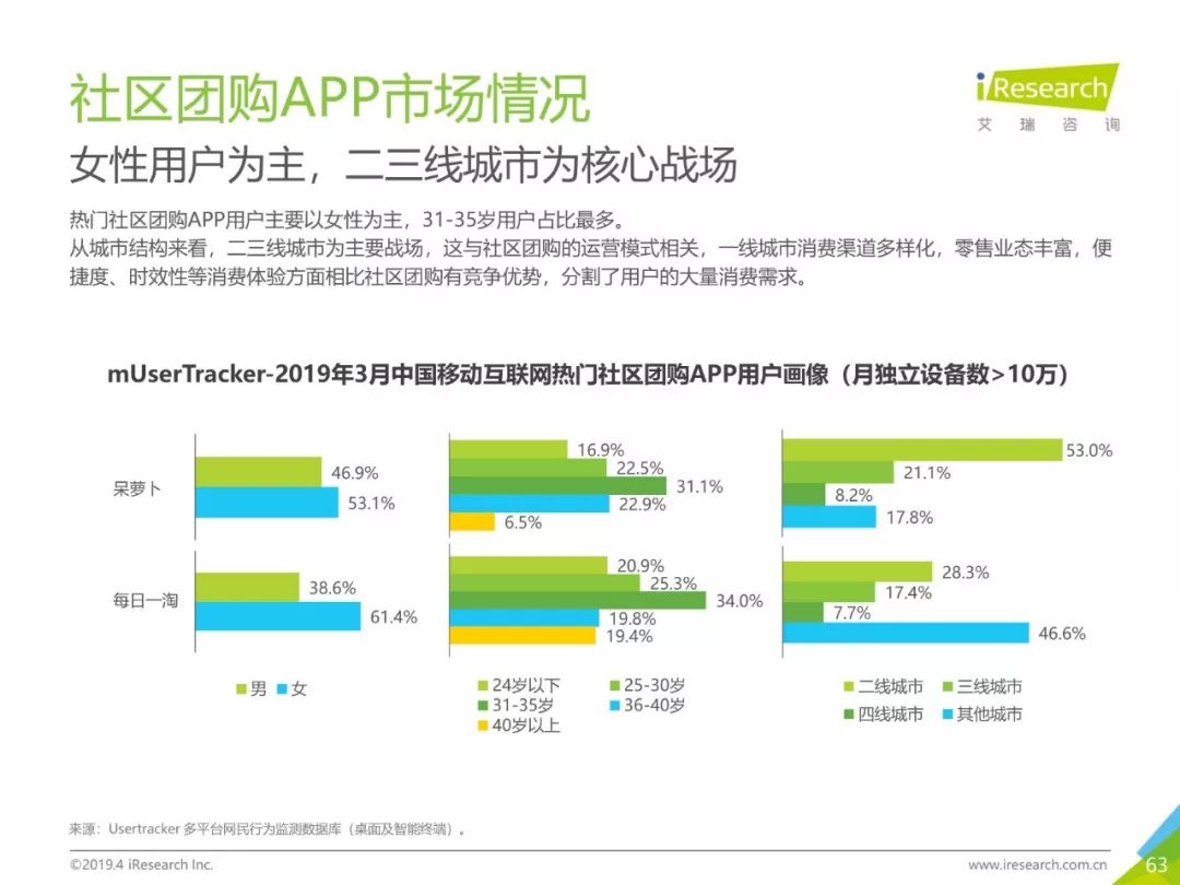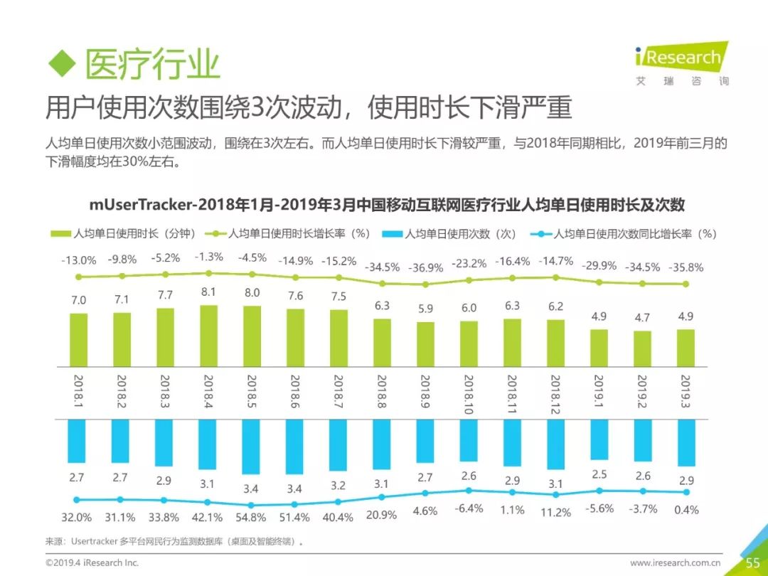 健康话题引起用户关注,大数据助力健康医疗生态,健康医疗行业成为2019年Q1热门行业。2019年3月,月独立设备数已达0.98亿台,行业增长主要来自健身运动,医疗行业粘性提升。同时小程序加持,社区团购成为热门流量风口,2019年3月,热门社区团购小程序“群接龙”月独立设备数已达到496.7万台,远远超过社区团购头部APP市场规模,小程序市场为社区团购行业热门发展渠道。