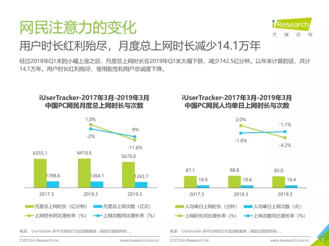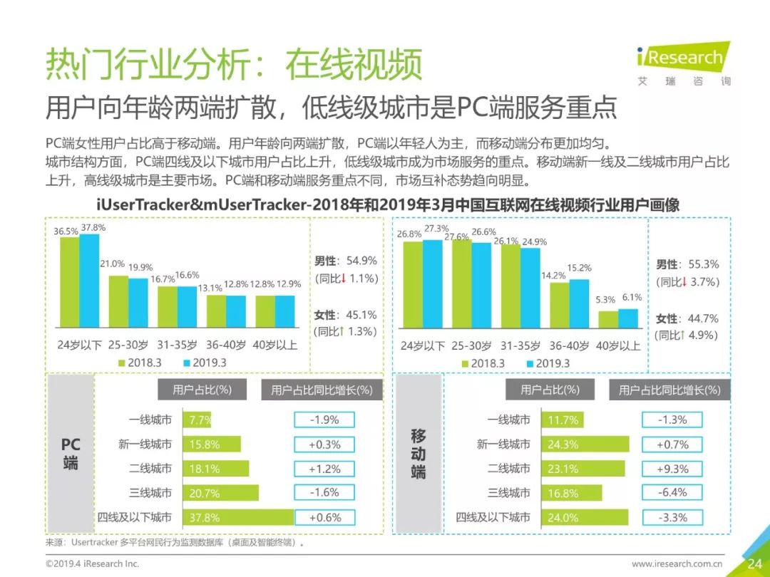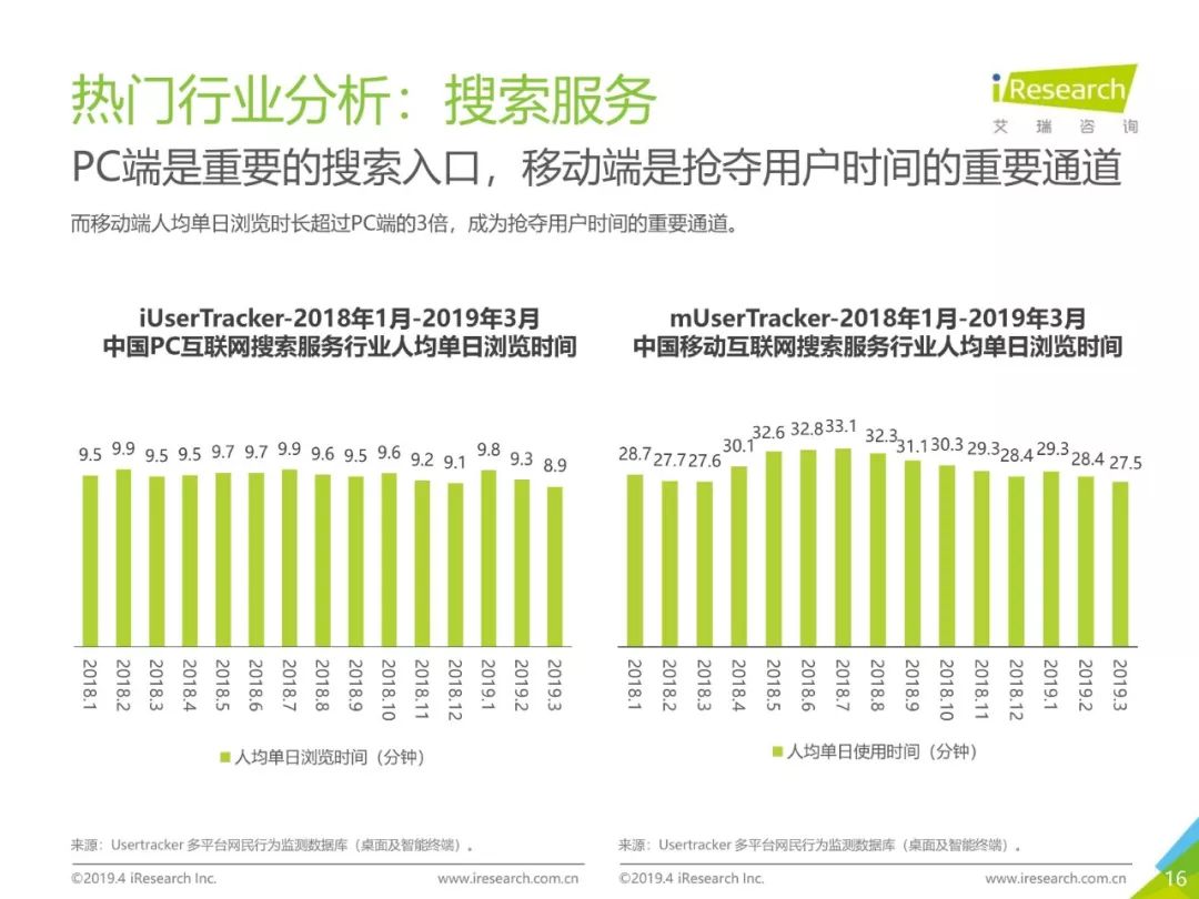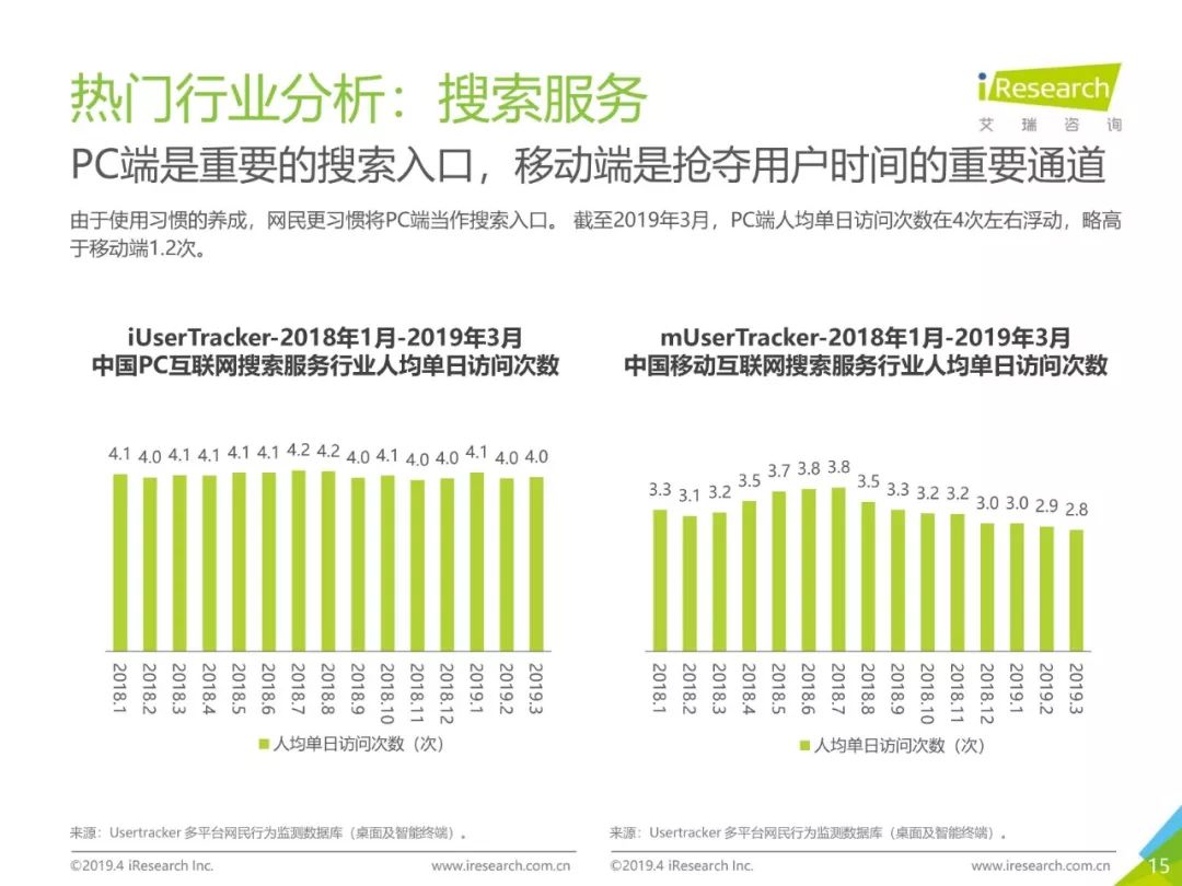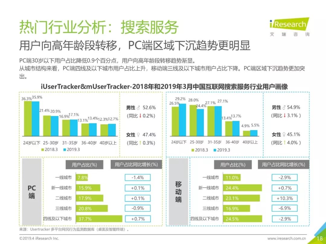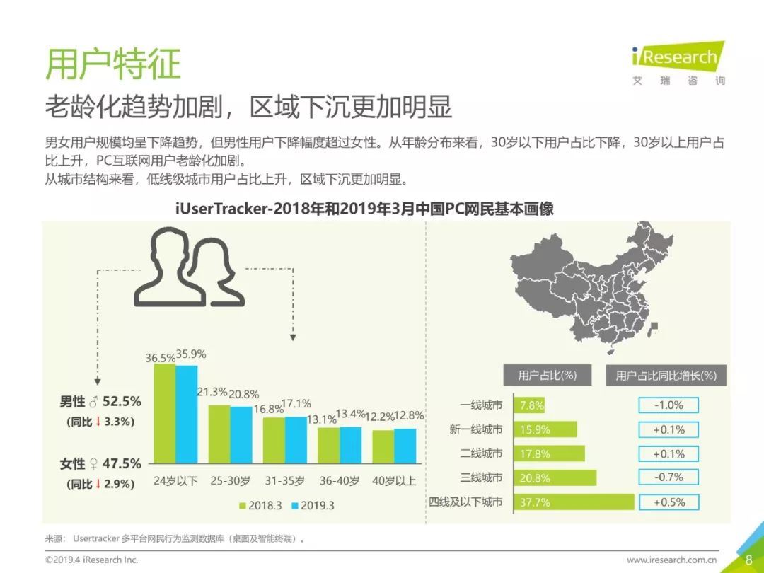 PC互联网用户人口红利减少,2019年3月用户规模达5.1亿,降速加快。用户以男性用户为主(52.5%),低线级城市用户占比上升,下沉效果明显。用户时长红利消失殆尽,2019年3月,人均单日上网时长同比减少4.2%,人均单日上网次数同比减少1.1%。