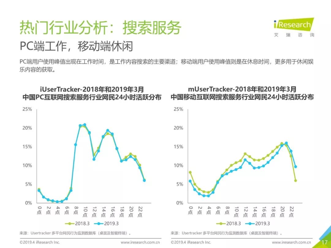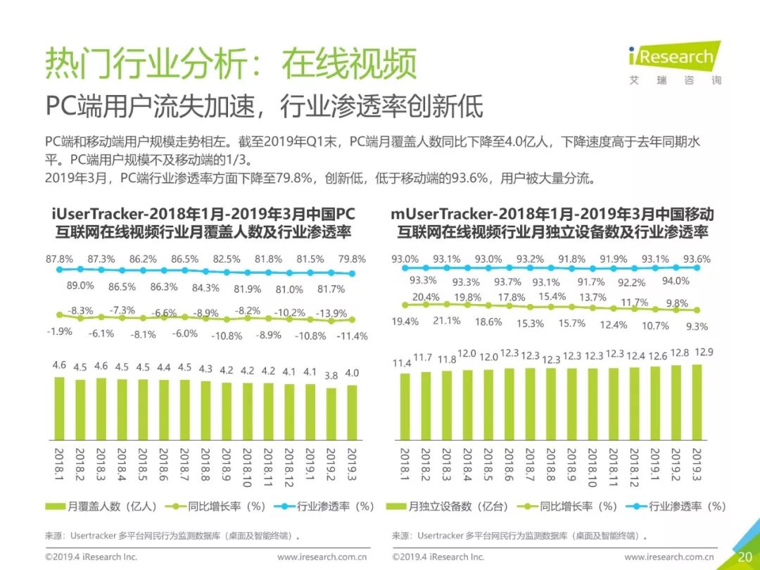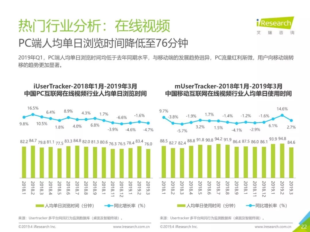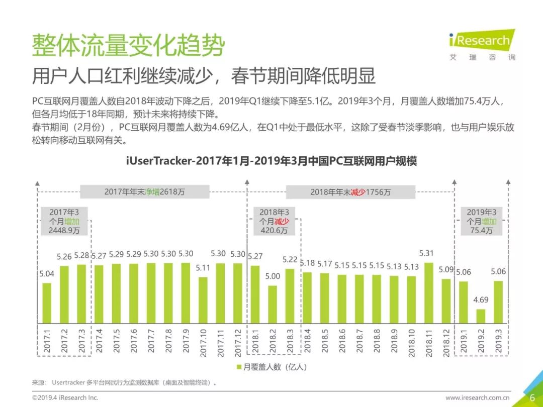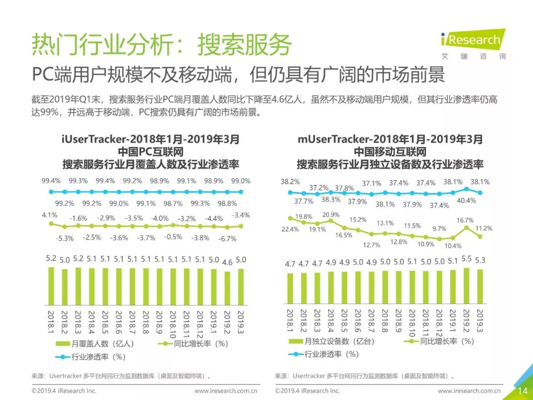 PC互联网用户人口红利减少,2019年3月用户规模达5.1亿,降速加快。用户以男性用户为主(52.5%),低线级城市用户占比上升,下沉效果明显。用户时长红利消失殆尽,2019年3月,人均单日上网时长同比减少4.2%,人均单日上网次数同比减少1.1%。