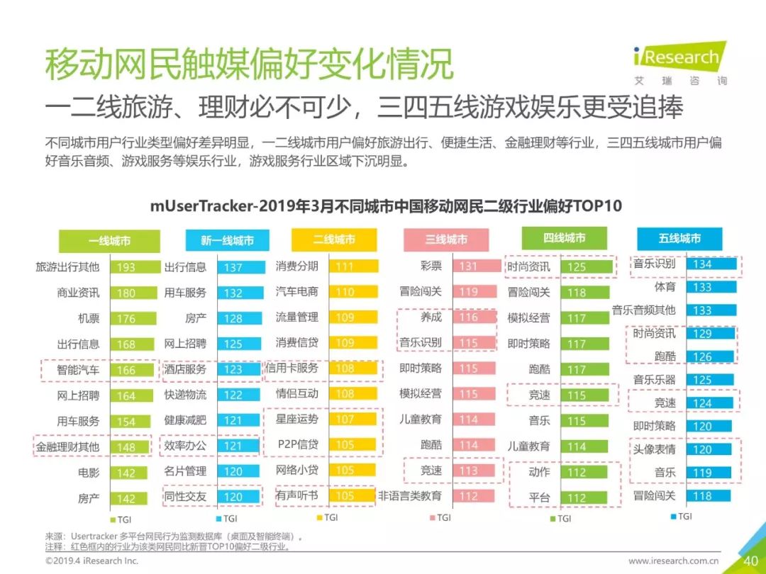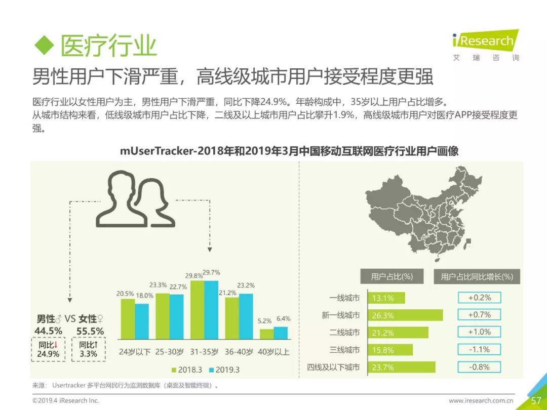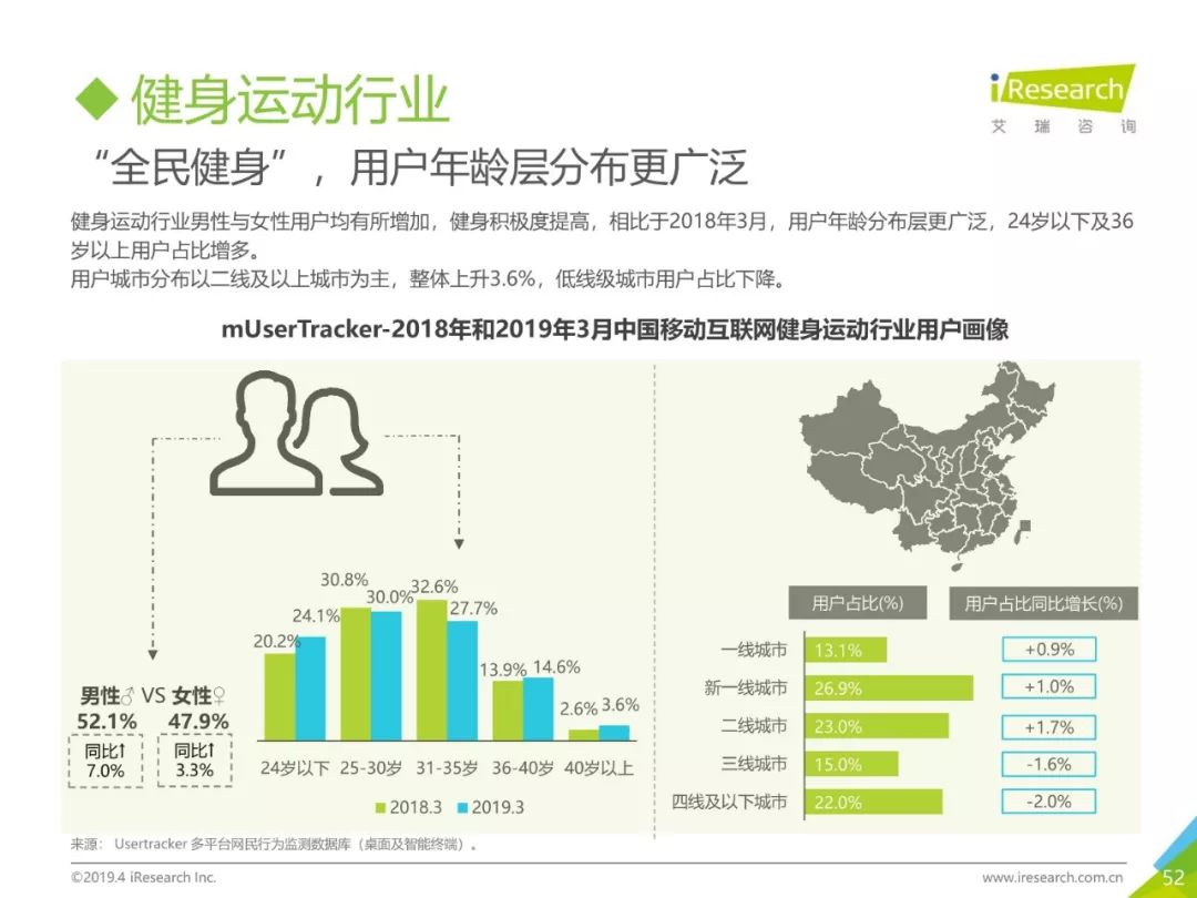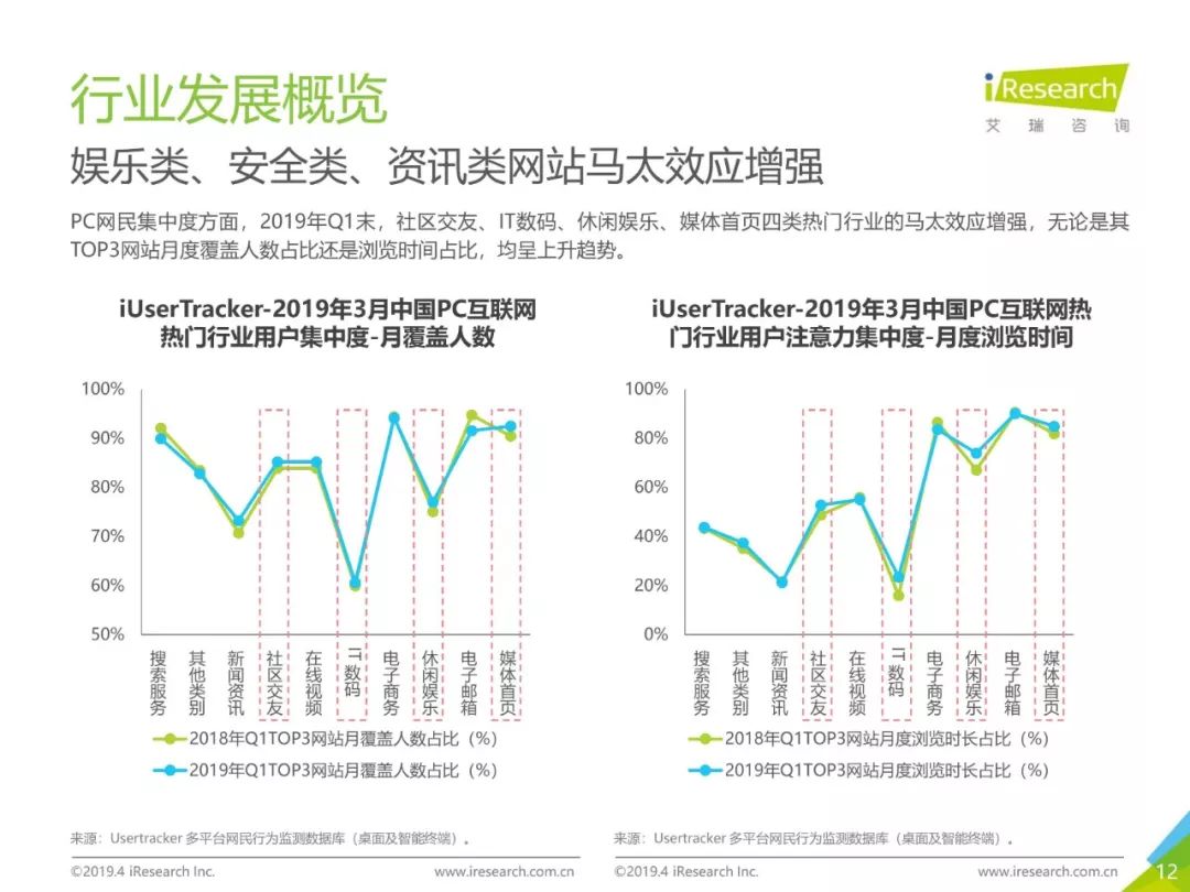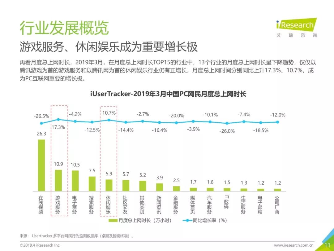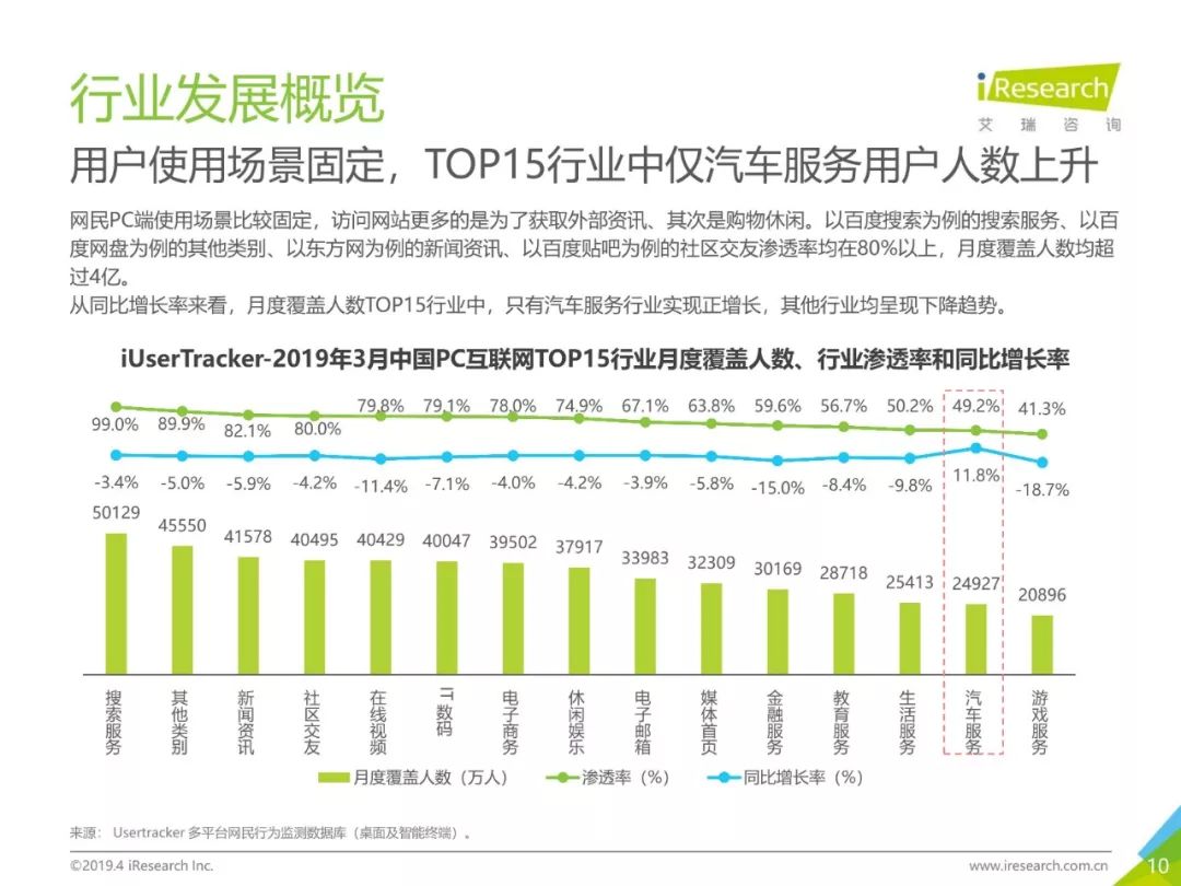 PC互联网用户人口红利减少,2019年3月用户规模达5.1亿,降速加快。用户以男性用户为主(52.5%),低线级城市用户占比上升,下沉效果明显。用户时长红利消失殆尽,2019年3月,人均单日上网时长同比减少4.2%,人均单日上网次数同比减少1.1%。