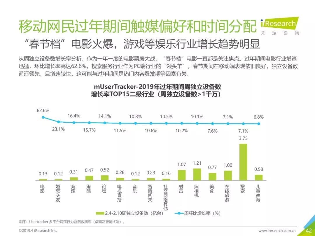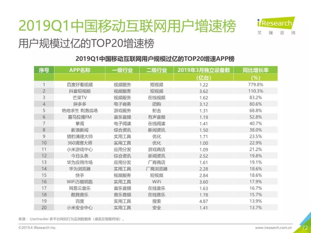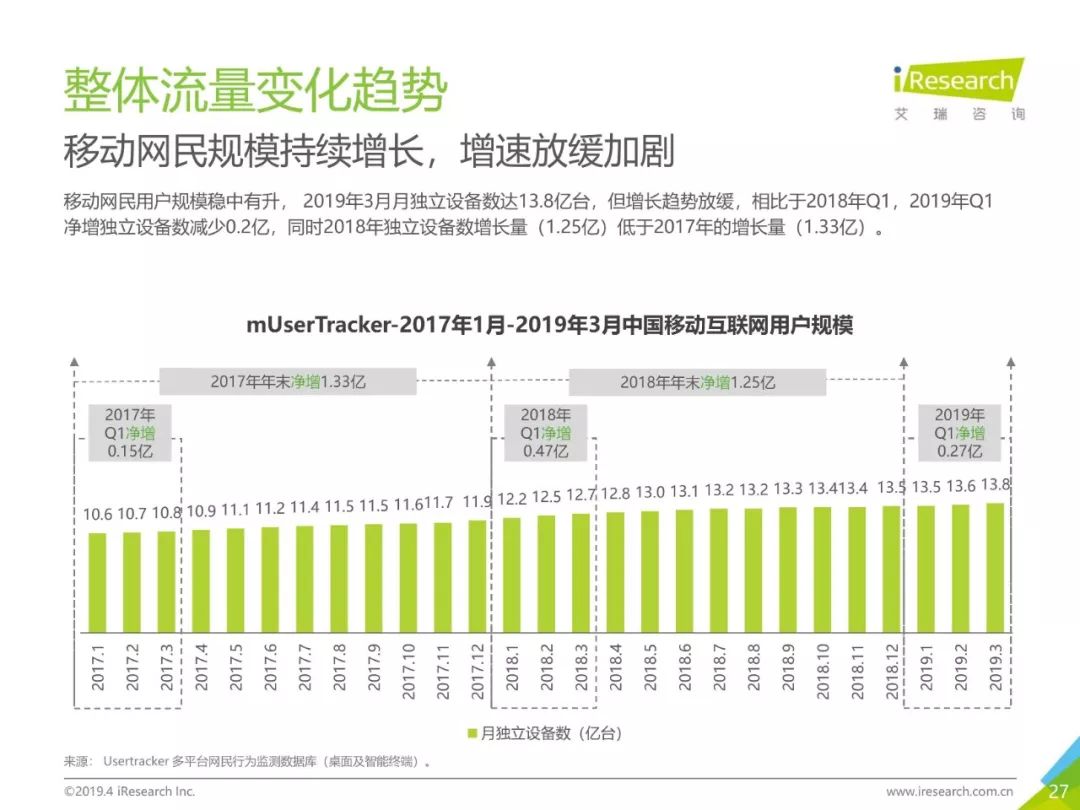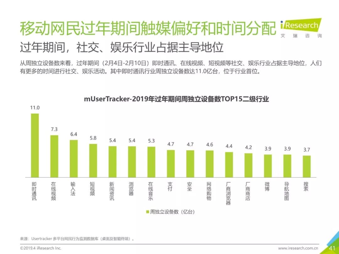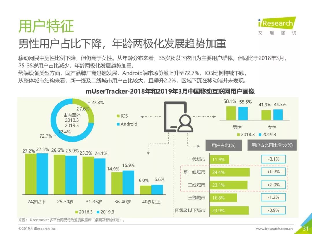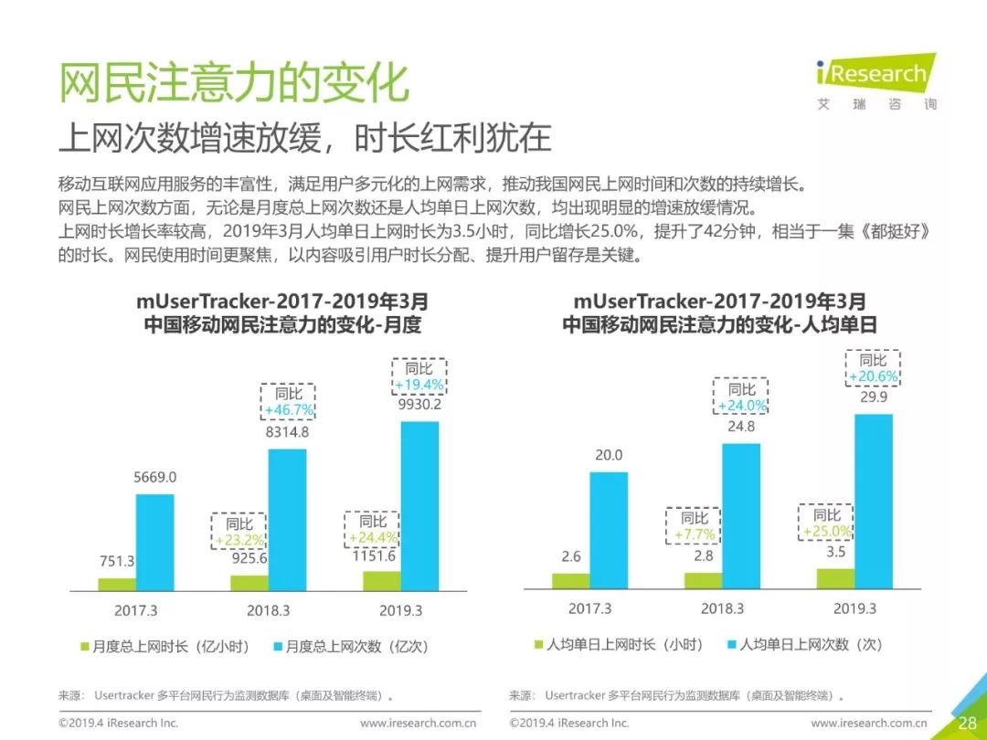 移动网民规模持续增长,增速放缓加剧,2019年3月,移动互联网月独立设备数已达13.8亿台。用户分布中,男性用户占比下降,年龄两极化发展趋势加重,区域下沉在移动端并未表现。上网次数增速放缓,时长红利犹在,2019年3月,人均单日上网时长为3.5小时,同比增长25.0%,提升了42分钟,相当于一集《都挺好》的时长。