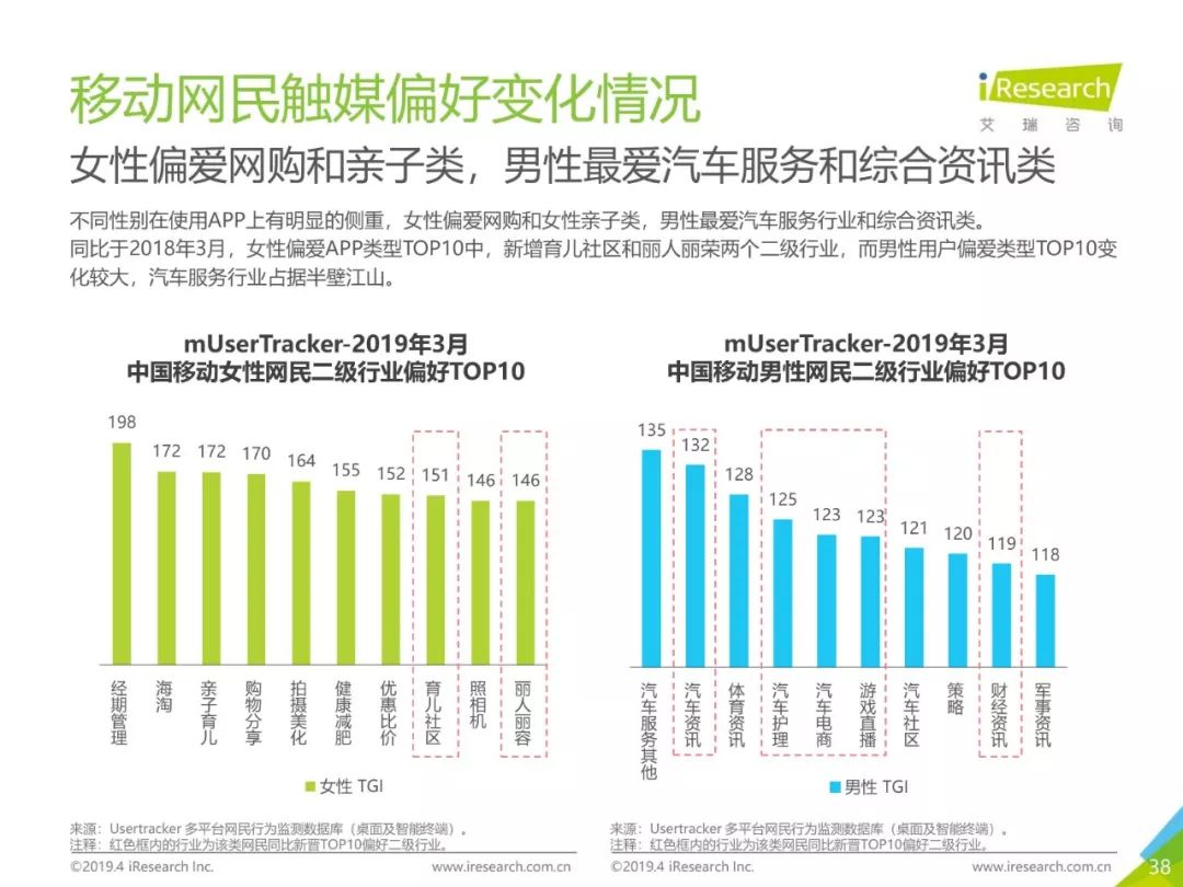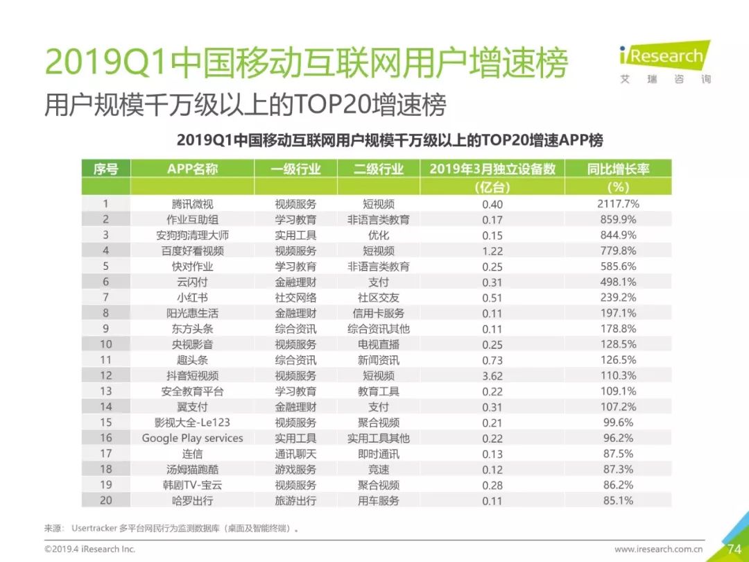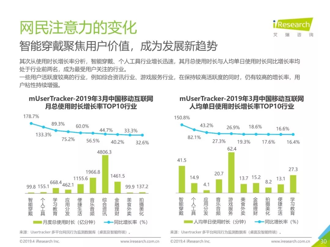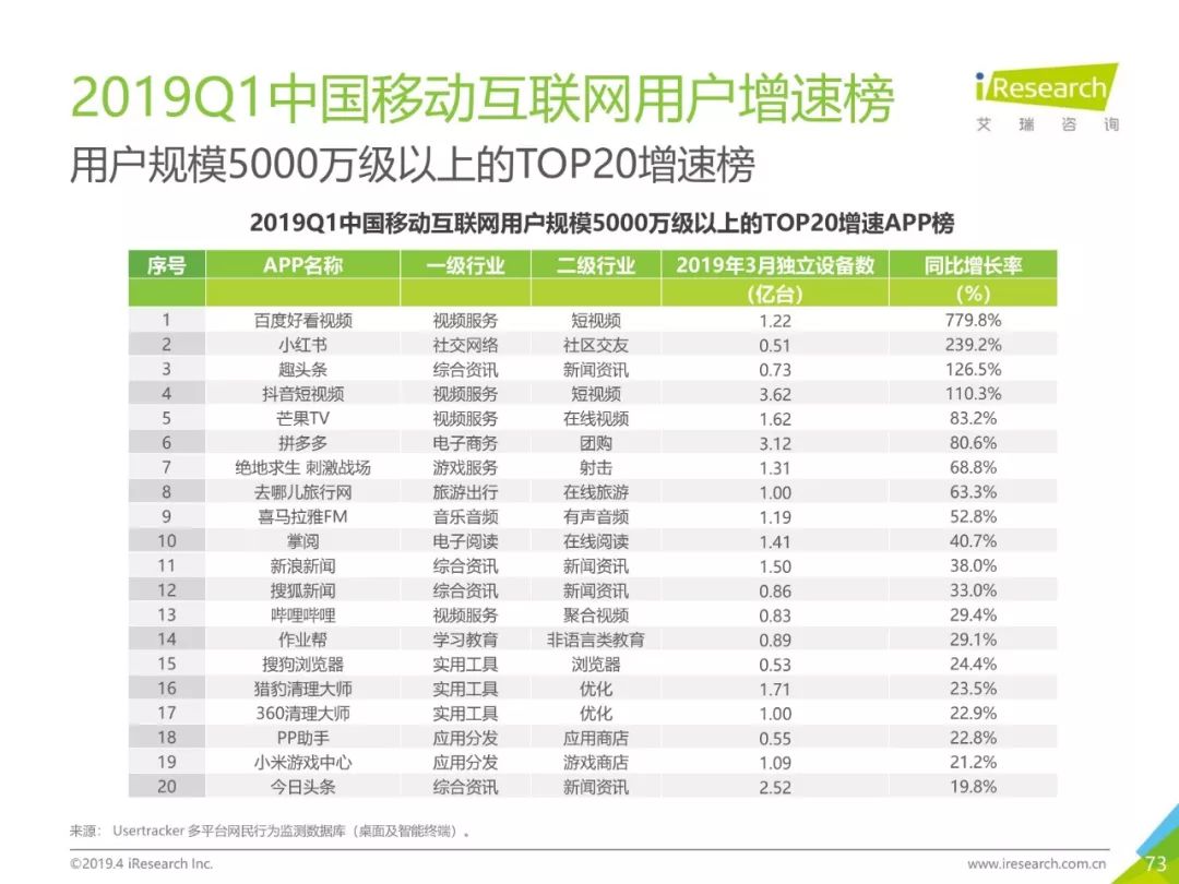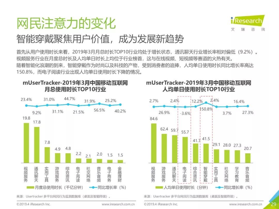 移动网民规模持续增长,增速放缓加剧,2019年3月,移动互联网月独立设备数已达13.8亿台。用户分布中,男性用户占比下降,年龄两极化发展趋势加重,区域下沉在移动端并未表现。上网次数增速放缓,时长红利犹在,2019年3月,人均单日上网时长为3.5小时,同比增长25.0%,提升了42分钟,相当于一集《都挺好》的时长。