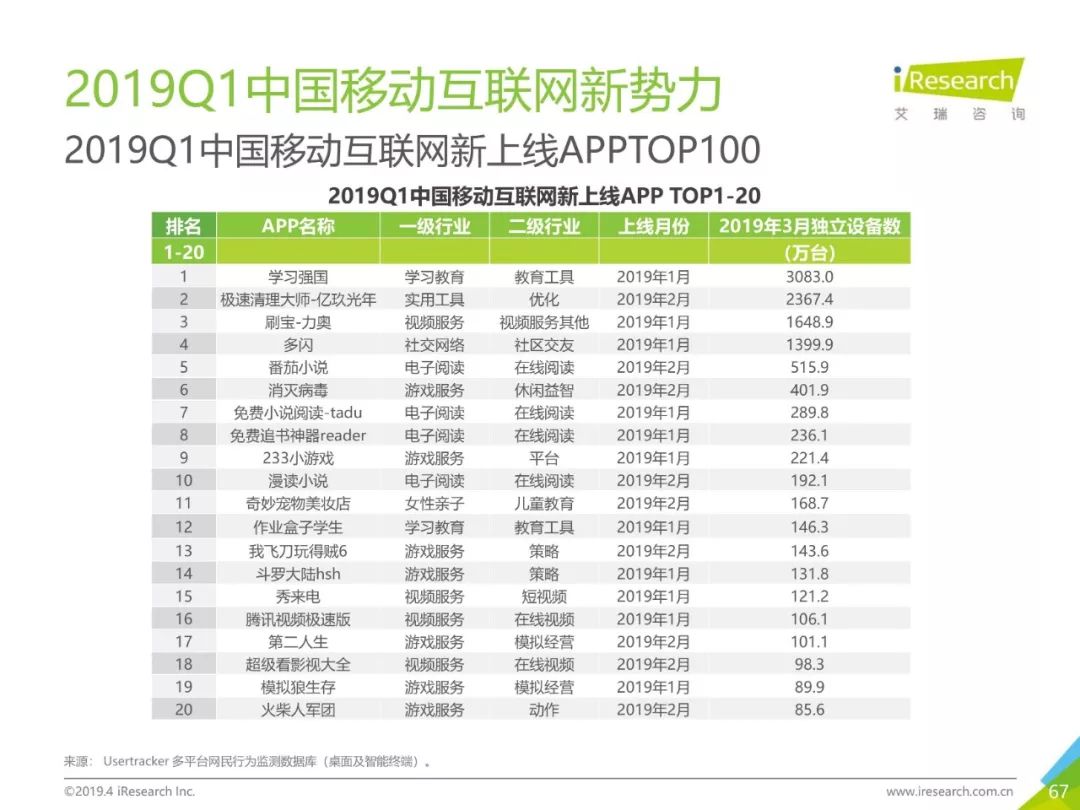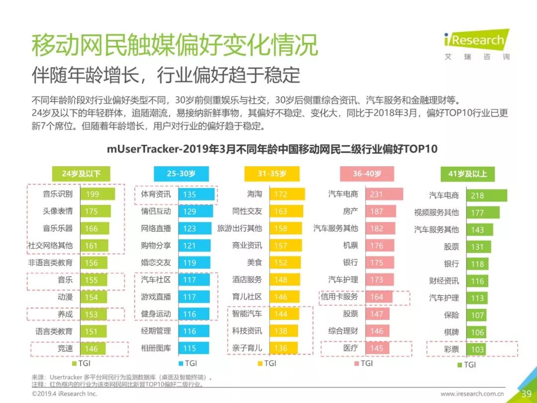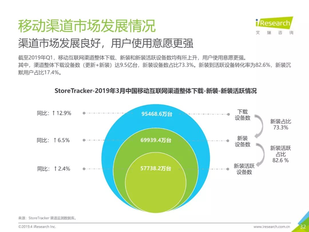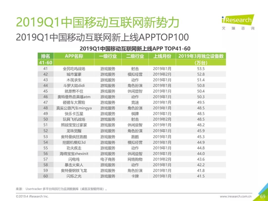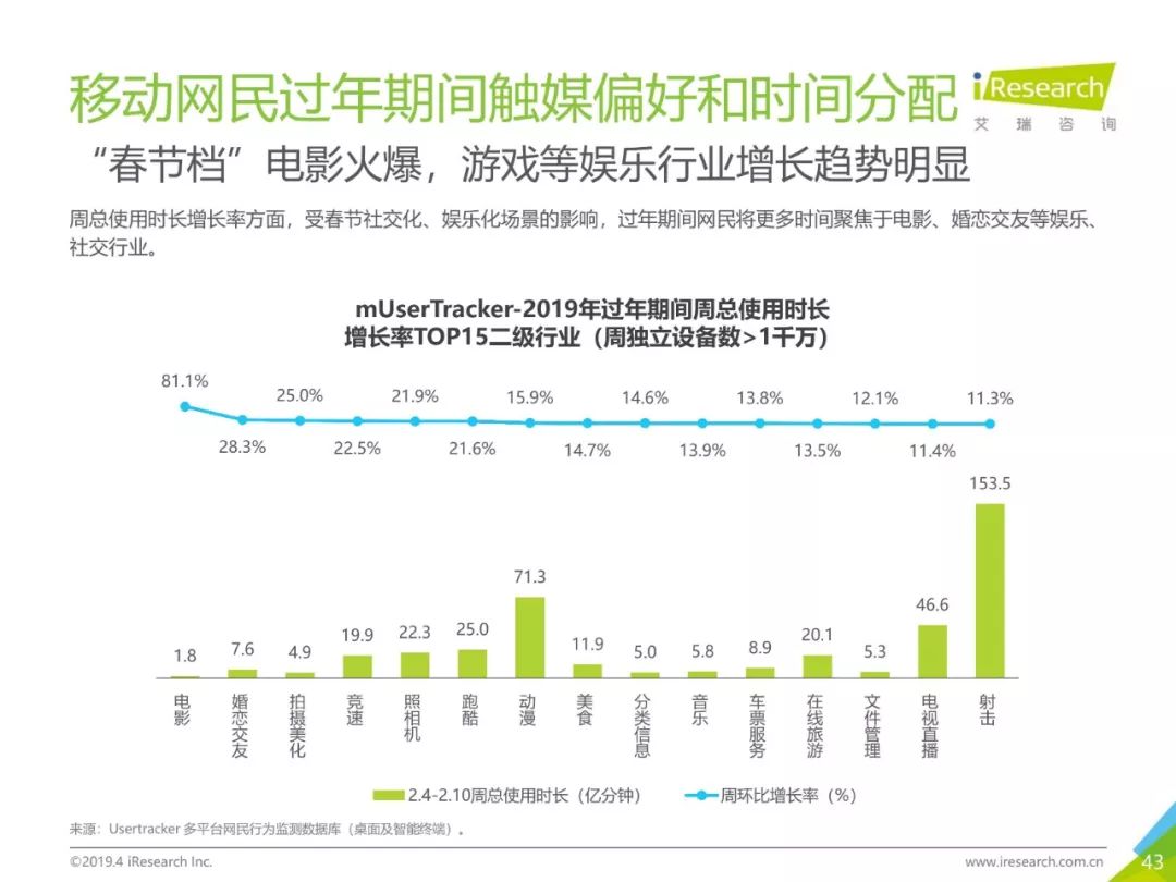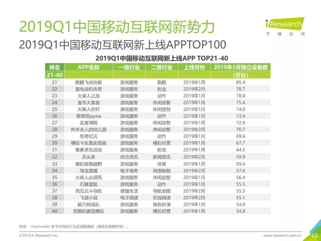 移动网民规模持续增长,增速放缓加剧,2019年3月,移动互联网月独立设备数已达13.8亿台。用户分布中,男性用户占比下降,年龄两极化发展趋势加重,区域下沉在移动端并未表现。上网次数增速放缓,时长红利犹在,2019年3月,人均单日上网时长为3.5小时,同比增长25.0%,提升了42分钟,相当于一集《都挺好》的时长。