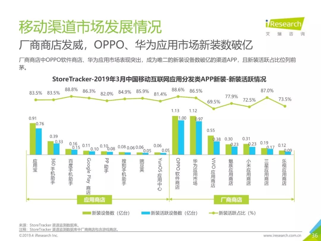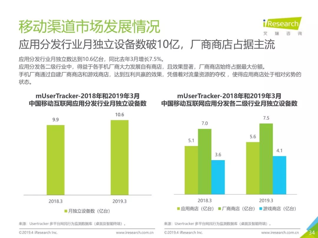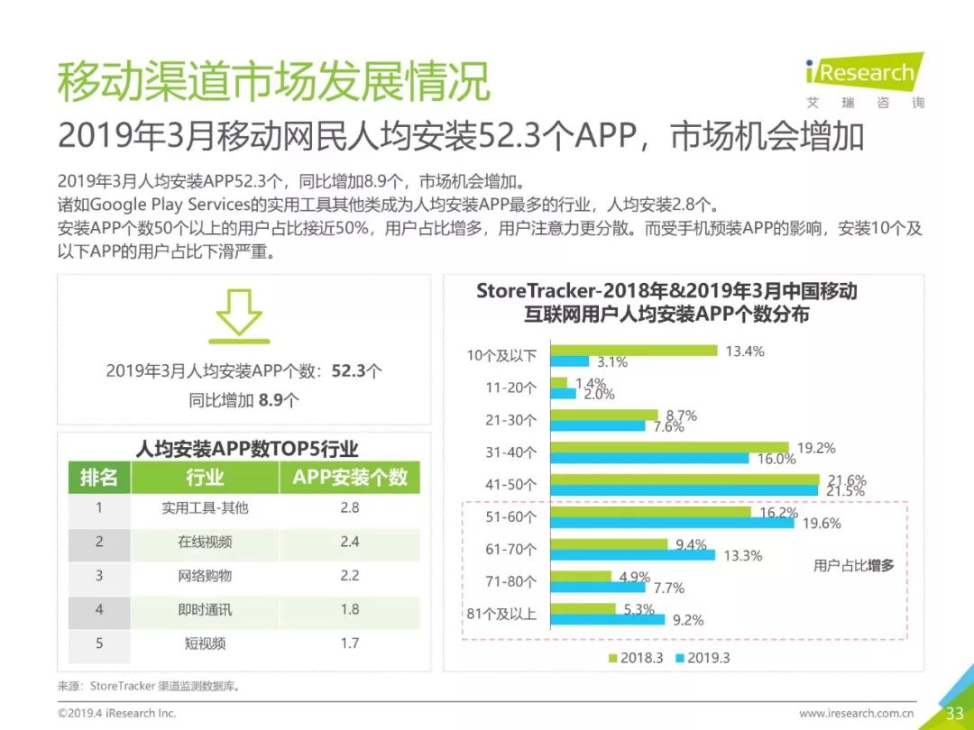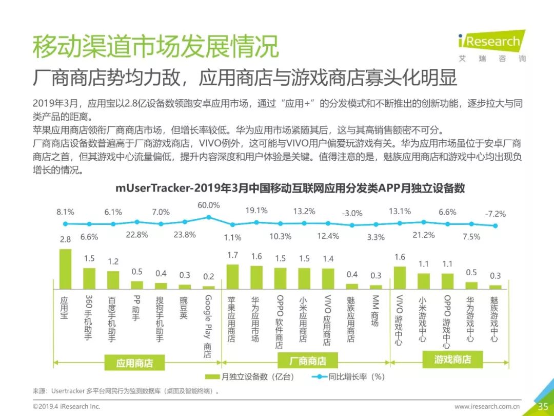 移动网民人均安装52.3个APP,市场机会增加,应用分发APP保持增长趋势。手机厂商通过自建厂商商店和游戏商店,达到互利共赢的效果。应用宝以2.8亿设备数领跑安卓应用市场,苹果应用商店领衔厂商商店市场,但增长率较低,VIVO游戏中心领跑游戏商店市场。