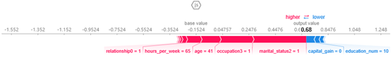 ① 解释 Output value ( 单个样本 ) 和 Base value ( 全体样本 Shap 平均值 ) 的差异,以及差异是由哪些特征造成的