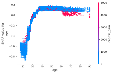 ② Y轴(左):一个样本的 age 对应的 Shap 值