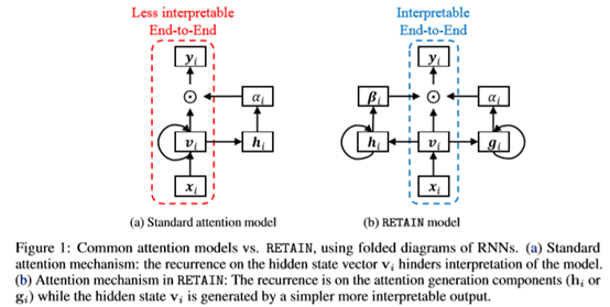 论文使用称为 RETAIN 的建模策略解决了这个限制,这是一种两级神经网络顺序数据的注意模型,提供对预测结果的详细解释保持与 RNN 相当的预测精度。为此,RETAIN 依赖于关注机制被建模以表示在遭遇期间医生的行为。一个区别 RETAIN 的功能 ( 参见图1 ) 是利用注意力生成来利用序列信息机制,同时学习可解释的表示。并模仿医生的行为,RETAIN 以相反的时间顺序检查患者的过去访问,从而促进更稳定的注意后代。因此,RETAIN 会识别最有意义的访问次数并量化访问量有助于预测的功能。