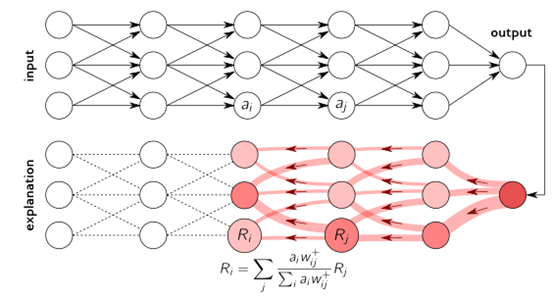 逐层相关性传播 ( LRP ) 是一种通过在神经网络中运行反向传递来识别重要像素的方法。向后传递是保守的相关再分配过程,其中对较高层贡献最大的神经元从其获得最大相关性。LRP 程序如下图所示。