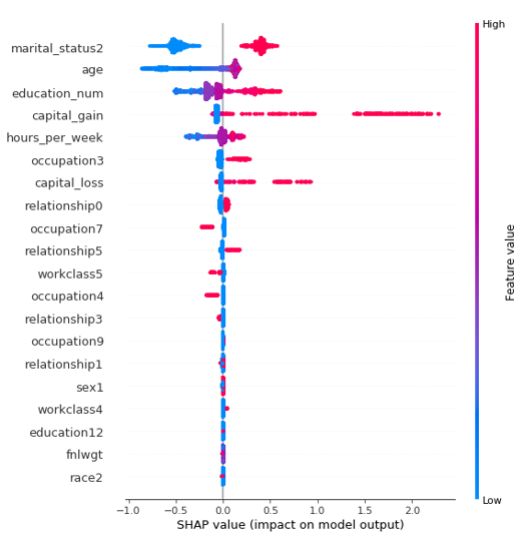 martial_status2 这个特征最重要,且值越大,收入会相对更高,到达一定峰值,会明显下降。