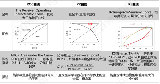 ③ KS ( Kolmogorov-Smirnov Curve ) 曲线横轴为不同的分类阈值,纵轴为真正率 ( TPr ) 和假正率 ( FPr ) 的变化曲线。KS 值 = max|TPr-FPr|,等价于 ΔTPr=ΔFPr,这和 ROC 曲线上找最优阈值的条件一致。KS 值常在征信评分模型中用于衡量区分预测正负样本的分隔程度。一般来说,KS 值越大,表明正负样本区分的程度越好,说明模型区分度越高。但并非所有的情况 KS 值都是越高越好的,尤其在征信模型中,如正负样本完全分错的情况下,KS 值依旧可以很高。征信模型最期望得到的信用分数分布为正态分布,如果 KS 值过大,如0.9,就可以认为正负样本分得过开了,不太可能是正态分布,反而比较可能是极端化的分布状态 ( 如 U 字型 ),这样的分数就很不好,基本可以认为不可用。