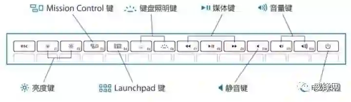 首先,在一些 Mac 键盘的顶行部分会有一些特殊功能的键盘,表示音量调节,亮度显示等: