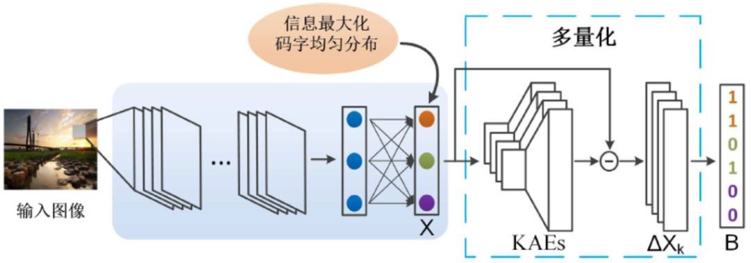 1. 针对量化信息损失大的问题,提出多量化非监督二值特征学习方法。该方法设计了深度K-自编码网络,采用多量化的方式学习数据适应的二值化过程,最小化二值特征的量化信息损失。该方法进一步引入了特征维度间竞争以获得更优的码长分配,采用更多的码字描述信息量丰富的维度,对数据进行充分的描述。