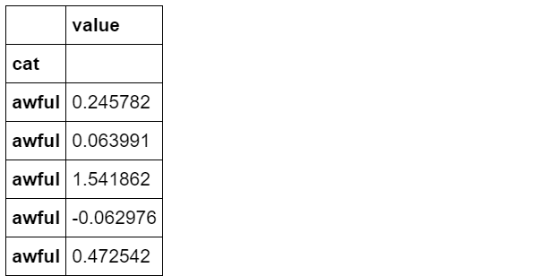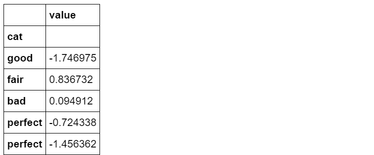 df_sort = pd.DataFrame({'cat':s.values,'value':np.random.randn(50)}).set_index('cat')df_sort.head()