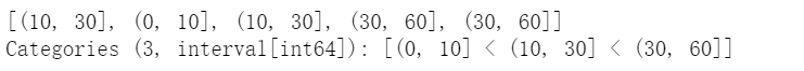 pd.cut(np.random.randint(0,60,5), [0,10,30,60], right=False, labels=['0-10','10-30','30-60'])