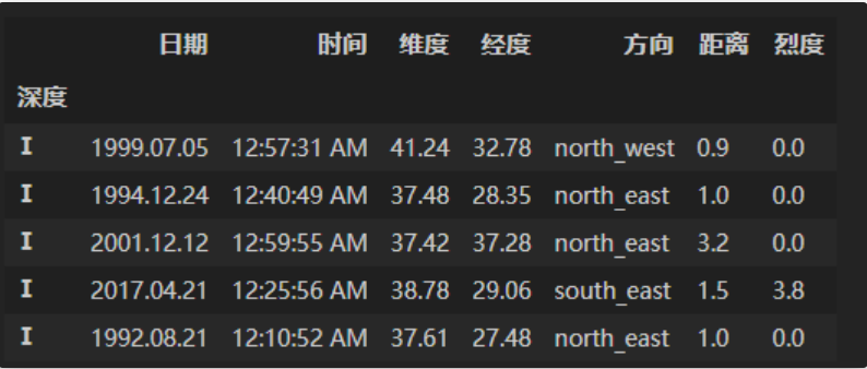 df = pd.read_csv('data/Earthquake.csv')df_result = df.copy()df_result['深度'] = pd.cut(df['深度'],[0,5,10,15,20,30,50,np.inf], right=False, labels=['Ⅰ','Ⅱ','Ⅲ','Ⅳ','Ⅴ','Ⅵ','Ⅶ'])df_result = df_result.set_index('深度').sort_index()df_result.head()