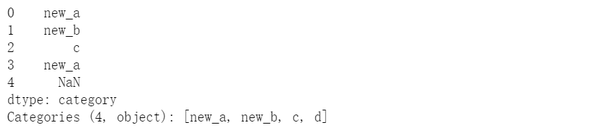 s = pd.Series(pd.Categorical(["a", "b", "c", "a",np.nan], categories=['a','b','c','d']))s.cat.set_categories(['new_a','c'])