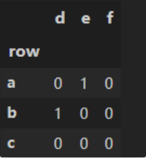 因为Categories中肯定包含出现的变量。所以将第一个参数作为index,第二个参数作为columns,建立一个DataFrame,然后把出现的变量组合起来,对应位置填入1即可。