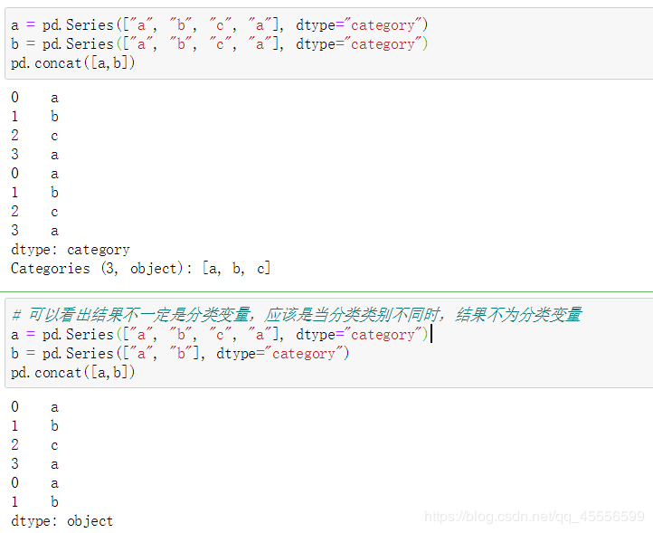union_categoricals也适用于组合相同类别和顺序信息的两个分类。