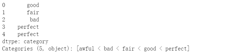s = pd.Series(np.random.choice(['perfect','good','fair','bad','awful'],50)).astype('category')s.cat.set_categories(['perfect','good','fair','bad','awful'][::-1],ordered=True).head()