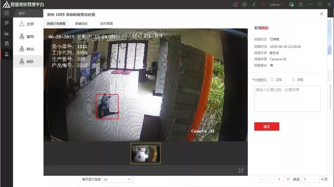 将基于AI开放平台训练的算法部署至位于景区关键节点的前端摄像机,当摄像机检测到游客“突然晕倒”的情况时,便会立即发送告警信号至景区管理中心,工作人员可点击告警信号弹出对应的视频画面确认现场情况,并根据现场实际情况及时呼叫附近工作人员前往救援,以第一时间保障游客的生命安全。