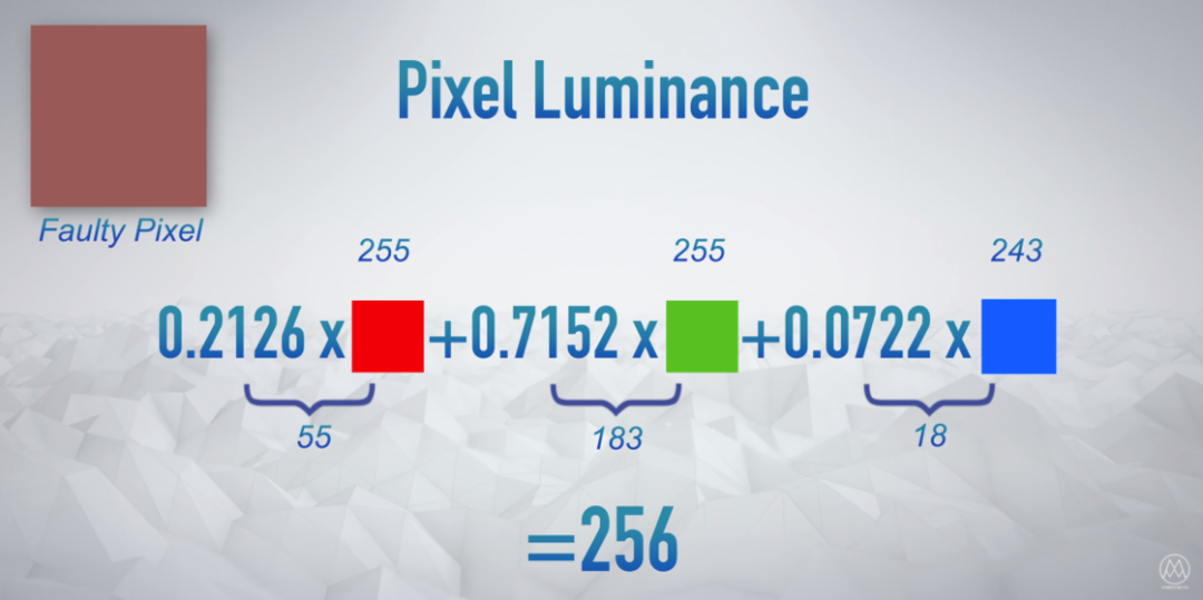 但为了避免最后的数字是浮点数(小数),这个算法好死不死有个取整数步骤,把红绿蓝三个子像素取整到下一个整数,这样加起来最后得到了 256 这个并不存在的像素亮度: