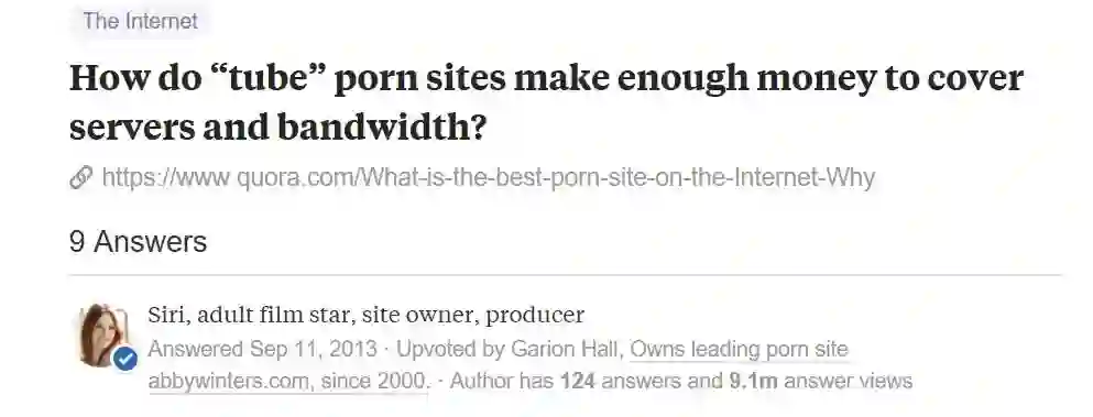 美版知乎Quora上有人问过“色情网站如何赚足够的钱来支付服务器和带宽?”的问题,拥有“成人电影演员”身份认证的用户Siri是这样回答的: