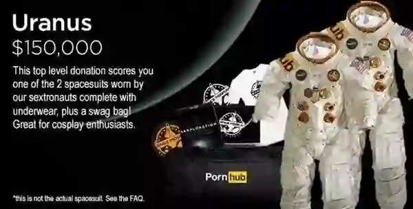 比如这两年流行的众筹。2015年PornHub在众筹网站Indiegogo上筹款,发起“Sexploration”的项目,筹款目标是340万美元,为的是能够在太空上拍摄一段宇航员角色的性爱影片。