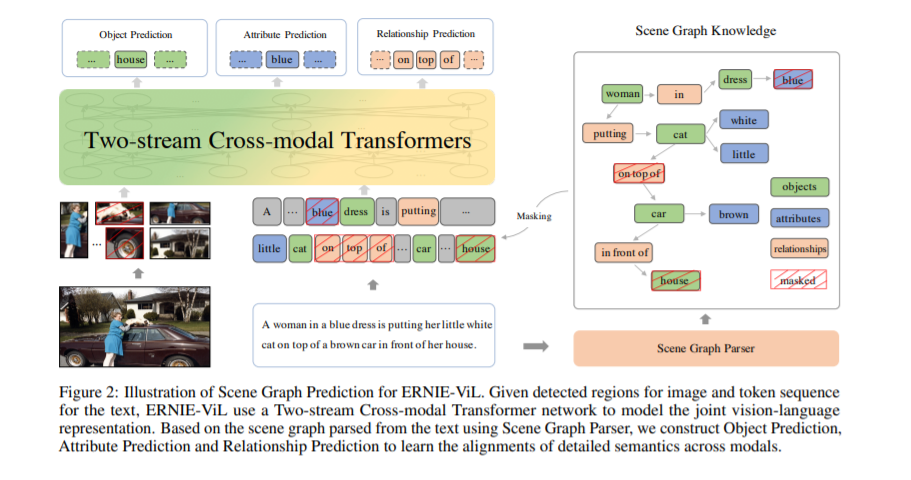 我们提出了知识增强的视觉-语言预训练技术ERNIE-ViL,将包含细粒度语义信息的场景图先验知识融入预训练过程,创建了物体预测、属性预测、关系预测三个预训练任务,在预训练过程中更加关注细粒度语义的跨模态对齐,从而学习到能够刻画更好跨模态语义对齐信息的联合表示。作为业界首个融入场景图知识的视觉语言预训练模型,ERNIE-ViL在视觉问答、视觉常识推理、引用表达式理解、跨模态文本检索、跨模态图像检索5个多模态典型任务上取得了SOTA效果,同时,在视觉常识推理VCR榜单上取得第一。