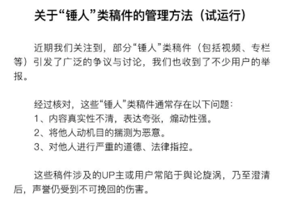 36氪获悉,6月17日,哔哩哔哩弹幕网发布了《关于“锤人”类稿件的管理方法(试运行) 》,B站表示,近期注意到部分“锤人”类稿件(包括视频、专栏等)引发了广泛的争议和讨论,即日起将升级社区规则,对争议性大的稿件和账号按程度增添争议标识,指控严重的将冻结账号。