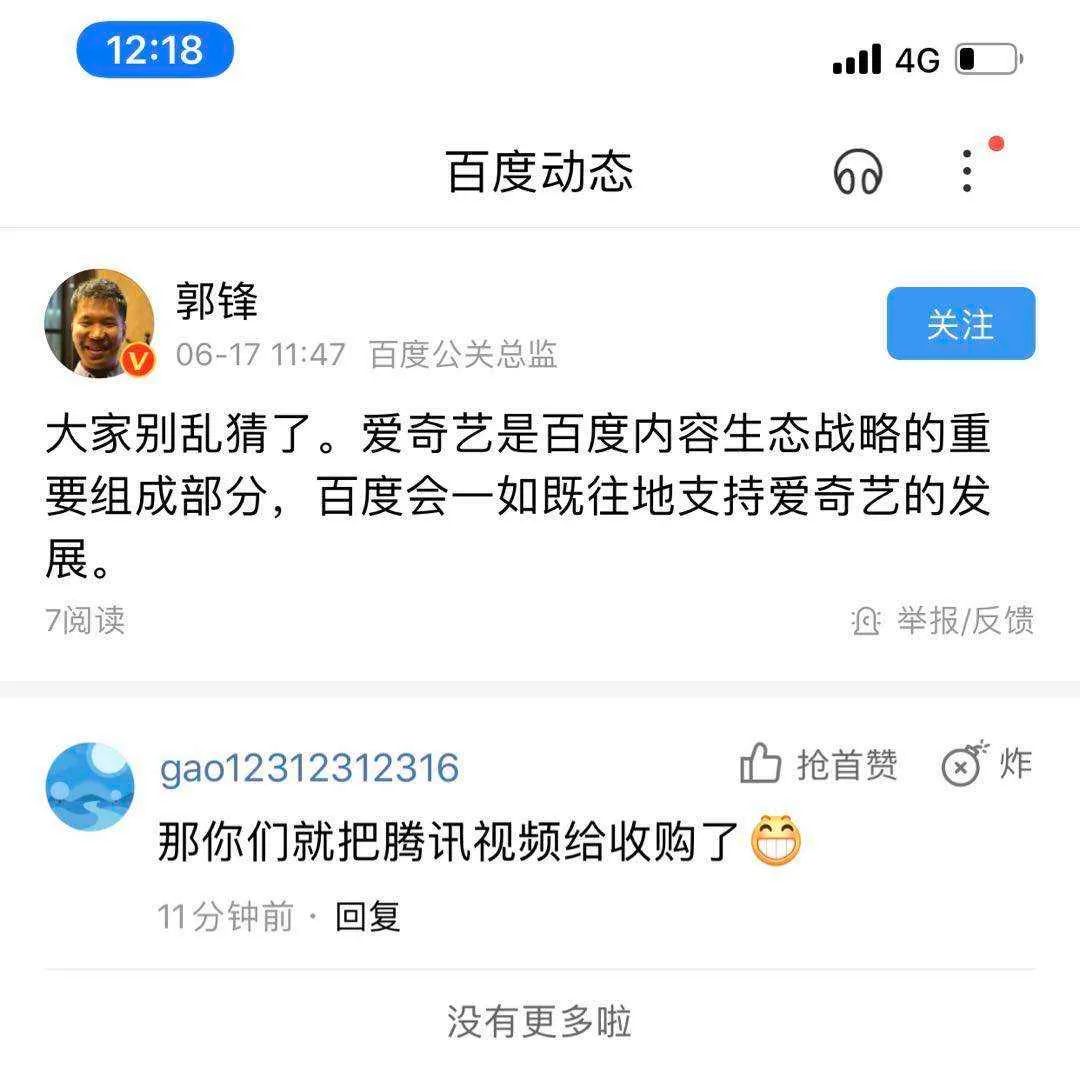 36氪获悉, 6月17日,针对“百度拟向腾讯出售爱奇艺股权”一事,在百度App上实名认证为“百度公关总监”的郭锋做出回应称:“大家别乱猜了。爱奇艺是百度内容生态战略的重要组成部分,百度会一如既往地支持爱奇艺的发展。”