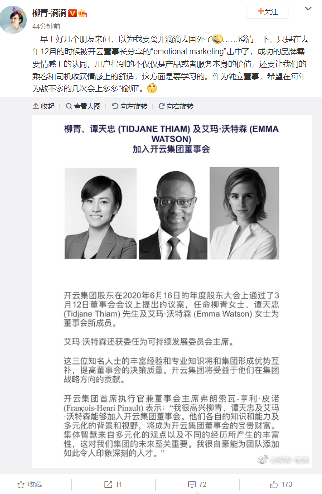 6月17日,滴滴出行总裁柳青发微博回应加入Gucci母公司开云集团董事会,称不是要离开滴滴去国外,“只是在2019年12月的时候被开云董事长分享的‘emotional marketing’击中了,成功的品牌需要情感上的认同,用户得到的不仅仅是产品或者服务本身的价值,还要让我们的乘客和司机收获情感上的舒适。作为独立董事,希望在每年为数不多的几次会上多多‘偷师’”。当地时间6月16日,开云集团宣布,滴滴出行总裁柳青、英国演员艾玛·沃特森、瑞士信贷前首席执行官蒂贾恩·蒂亚姆加入集团董事会。