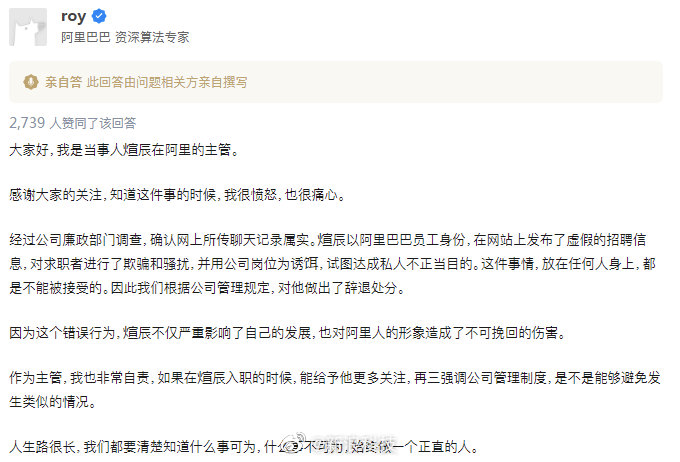 阿里P8招聘私人助理当事人领导发文称,经过阿里廉政部门调查,确认网上所传聊天记录属实。煊辰以阿里巴巴员工身份,在网站上发布了虚假的招聘信息,对求职者进行了欺骗和骚扰,并用公司岗位为诱饵,试图达成私人不正当目的。这件事情,放在任何人身上,都是不能被接受的。因此阿里根据公司管理规定,对他做出了辞退处分。(新浪科技)