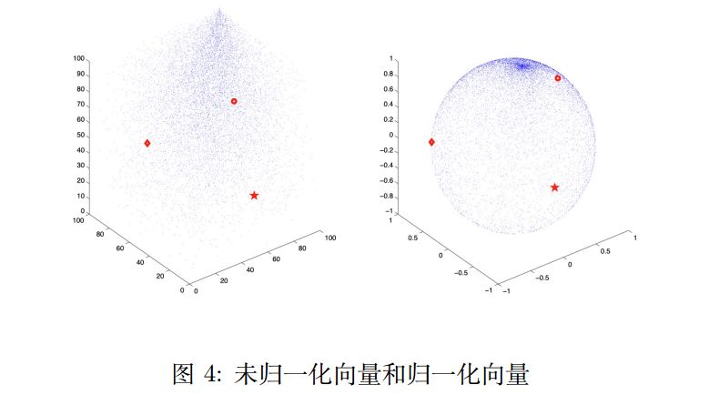 [Xing et al., 2015] 发现上述方法有几处不一致。词向量学习的时候使用的是内积(inner product),但是在选择词语的时候却是根据 cosine similarity,学习映射矩阵时,使用的是均方误差(mean square error),这些导致了几处不匹配。因此首先将词向量的长度限制为单位长度。这样相当于所有的向量都会在高维空间落在一个超球面上,如图4。这样就使得两个向量的内积和 cosine similarity 是一致的。然后将目标函数从以均方误差为目标修改为以 cosine similarity 为目标: