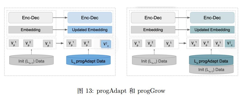 [Escolano et al., 2019] 利用不同语言之间共有的词表来作为知识迁移的桥梁,提出了两种方法,progAdapt 和 progGrow。第一种方法 progAdapt 将一种语言对的翻译任务迁移到另一种翻译任务上,保留词表中共享的部分,添加新任务的词语,词表大小保持不变,并使用新任务的数据。第二种方法 progGrow 利用递增的方式来学习一个多语言的机器翻译模型,将新语言的词表添加到旧词表上,并使用新旧任务一起的数据。如图13。