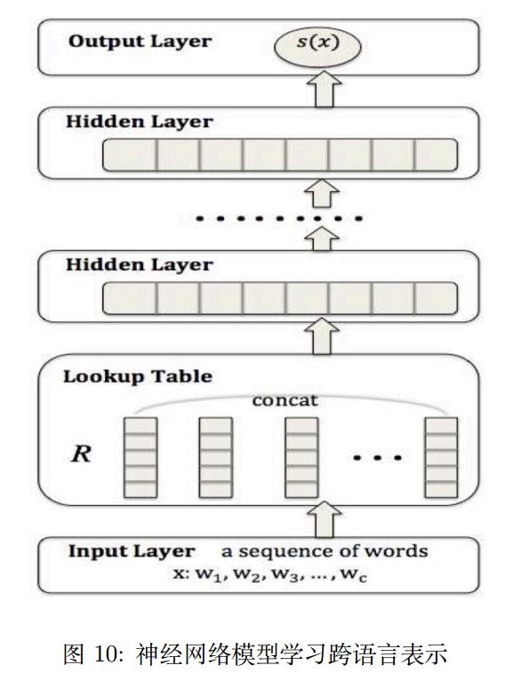 [Xiao and Guo, 2014] 利用 Wikitionary 作为两种语言之间的桥梁,构建了统一的双语词典。首先构建源语言词典,然后利用 Wikitionary 找到其所有的翻译。删除满足以下条件的翻译:一个源语言词语有多个目标语言翻译、一个目标语言词语有多个源语言翻译、源语言的目标语言翻译词语在目标语言数据集中没有出现。经过以上三步处理,可以得到一个一对一的双语词典。将源语言和目标语言建立统一的双语词表 V ,利用构建好的双语词典,在词表 V 中属于词典映射关系的两个词语将会被映射到相同的词向量空间。然后利用神经网络来学习词向量表示。其任务是一个二分类问题,输入是一个子句,通过替换正例中的词语来构建负例。最终会学习到统一双语词典的向量表示,以此作为双语空间的桥梁。其模型如图10。这种方法对齐词语有同一表示。