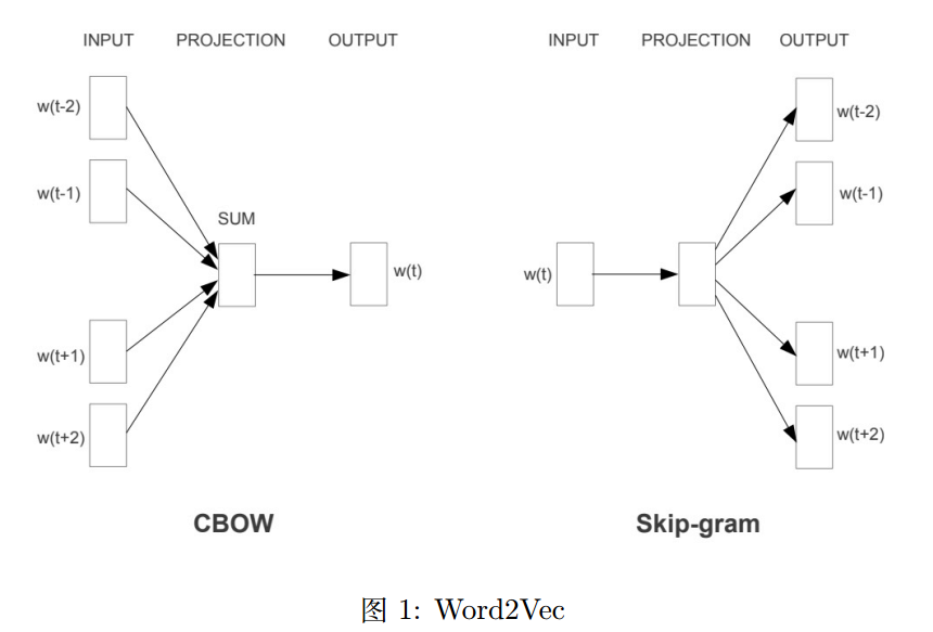 常用的单语词向量有 Word2Vec, GloVe, fastText 等。下面主要介绍一下 Word2Vec[Mikolovet al., 2013c,a],Word2Vec 基于分布式假设(Distributional hypothesis):拥有相似上下文(context)的词语通常拥有相似的含义。其算法分为 Skip-gram 和 Continuous Bag of Words(CBOW)。Skipgram 根据中心词预测周围的词, CBOW 根据周围的词预测中心的词语,如图1。