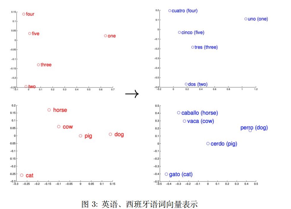 [Mikolov et al., 2013b] 观察发现,不同语言的词向量在向量空间中有着相似的几何排列。如图3。