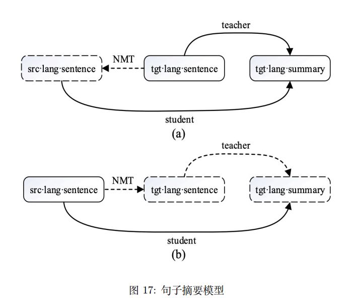 [Duan et al., 2019, Shen et al., 2018] 利用知识蒸馏结合机器翻译来完成跨语言句子摘要任务。其核心想法为使用现有句子摘要数据集训练教师模型,为跨语言句子摘要模型提供监督信号。同时还利用目标输入句作为中间桥梁,来利用两个方向的注意力权重来指导生成。其基本执行流程如图17。