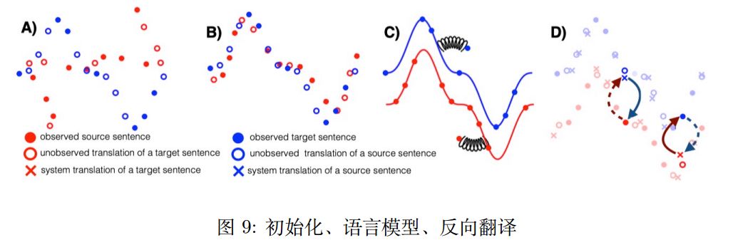 [Lample et al., 2018] 指出了 [Lample et al., 2017, Artetxe et al., 2017] 几点特点:使用无监督方法推理出来的词典来初始化系统,使用了基于 Seq2Seq 的降噪自编码器模型,使用 back translation来将无监督问题转换为有监督问题。同时使用了对抗训练来将不同语言编码到同一空间。本文总结了无监督机器翻译的三个核心点。第一点,初始化,初始化可以帮助模型具有一定的先验知识。第二点,语言模型,根据大规模的单语语料可以学习到好的语言模型。第三点,迭代的反向翻译,该方法可以将无监督转换为有监督,可以完成翻译任务的学习。如图9。
