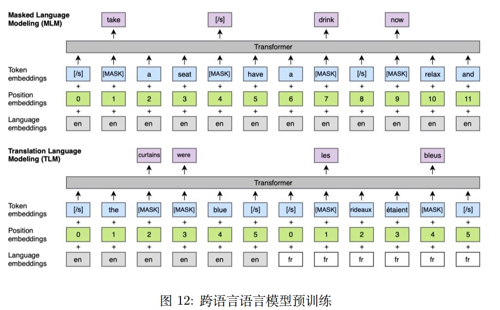 [Lample and Conneau, 2019] 提出了基于多种语言预训练的模型 XLMs,首先从单语语料库中采样一些句子,对于资源稀少的语言可以增加数量,对于资源丰富的语言可以减少数量,将所有语言使用统一 BPE 进行表示。使用三种语言模型目标来完成学习。前两个是基于单语语料库的,最后一个是基于双语对齐数据的。第一种是 Causal Language Modeling (CLM),根据之前的词语预测下一个词语。第二个是 Masked Language Modeling (MLM),和 BERT 类似,但是使用一个词语流,而非句子对。第三种是 Translation Language Modeling (TLM),可以随机 mask 掉其中一些两种语言中的一些词语,然后进行预测。其模型如图12。