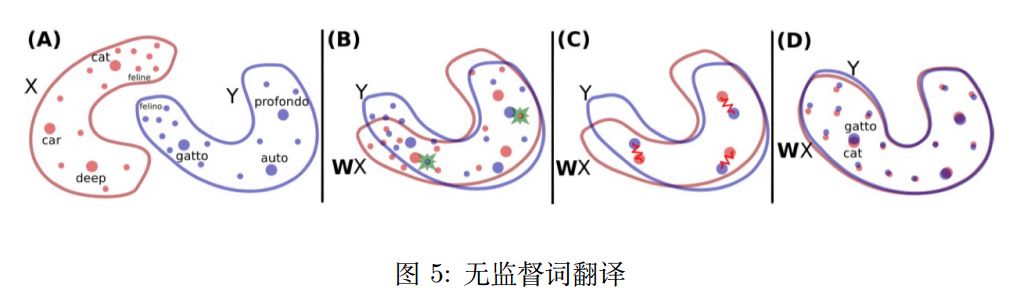 之前的方法都是依赖于平行语料的,接下来主要介绍一些无监督的工作,也是当前比较热门的方向。[Conneau et al., 2017] 提出了一种完全无监督的词级别的翻译(对齐)方法,首先使用对抗训练将两种语义空间对齐,然后使用迭代的方式来一步步更新学习到的映射矩阵,并提出了一种 CSLS方法来检索最近的翻译词语。如图5。