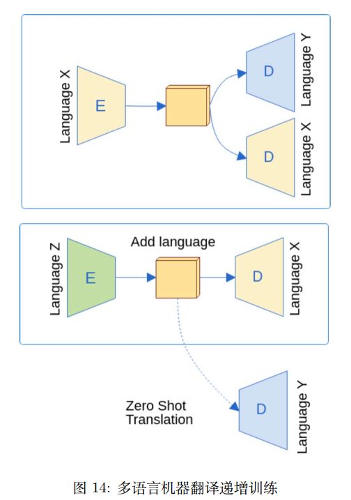 [Pires et al., 2019] 指出 [Johnson et al., 2017, Escolano et al., 2019] 的问题在于当语言的词表有显著的不同时,例如中文,词表会变得很大。因此提出了一种方法,每一种语言有自己的特定的编码器和解码器,编码器和解码器之间不共享参数。对于一个翻译对 X-Y,会完成自编码任务(X-X, Y-Y)和翻译任务(X-Y, Y-X),同时会要求编码器得到的两种表示相近。新来一种语言以后 Z,假设目前有 Z-X 的平行语料,只需要添加 Z 语言的编码器,然后固定住 X 语言的解码器参数来进行训练,这个过程只更新 Z 编码器的参数。如图14。