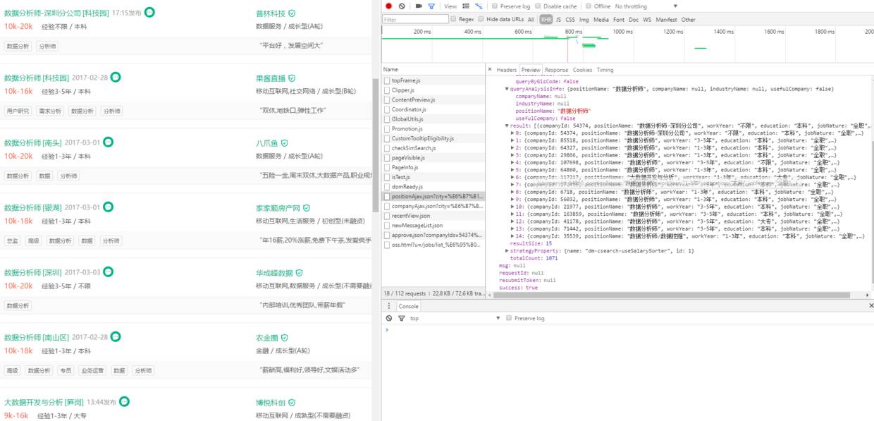 这是深圳地区的数据分析师页面,用Chrome检查打开。在XHR中可以看到一个以postionAjax.json开头的脚本,打开Preview看一下,可以看到: