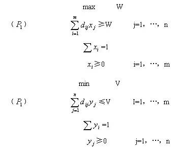 一般若D=(d1,d2,……,dm),S=(s1,s2,……,sn),支付矩阵F=(dij)mxn已知,那么对策G={D,S,F}的线性规划问题为: